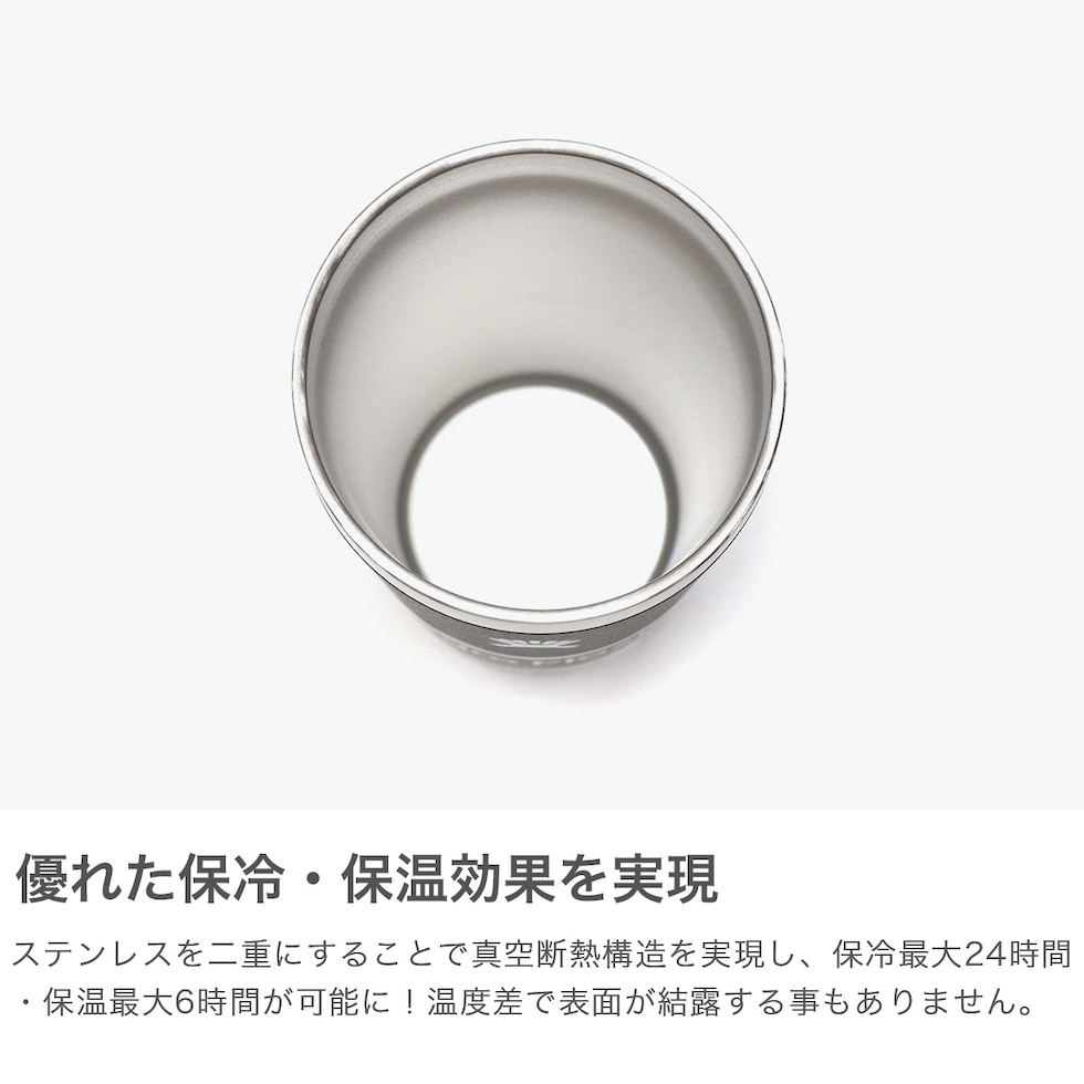 保温保冷タンブラー アウトドアや日常で手軽にドリンクを持ち運べるタンブラー。真空断熱構造で、長時間の保冷・保温に優れ、いつでもちょうどよい温度の飲み物が楽しめます。温度差で表面が結露することがないのも嬉しいポイント。また、ボディ表面に特殊なパウダー加工を施し、濡れた手でも握りやすく滑りにくい、気の利いた設計。オフィスやアウトドアでほっと一息つくのにもちょうどよい354ml容量のサイズ感です。 |