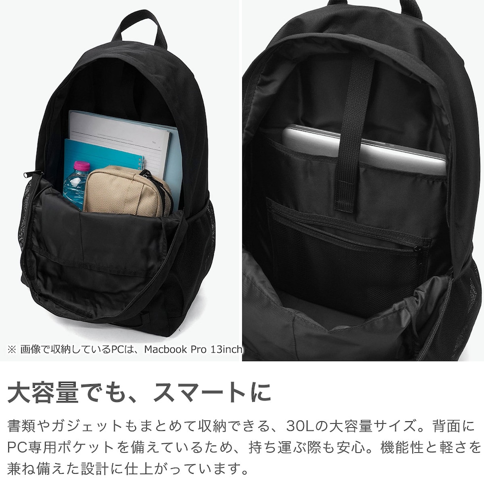 性別やシーンを問わず活躍するデイパックが登場!前面のテープ使いやシルバーのラバーネームがスポーティなアクセントに。30Lの大容量かつ軽量設計で、荷物が多い日も安心です。サイドポケットや背面ポケットなど多彩な収納を備え、持ち物の整理もスムーズに行えます。通学から旅行まで、日常をアクティブに支えてくれるアイテムです。