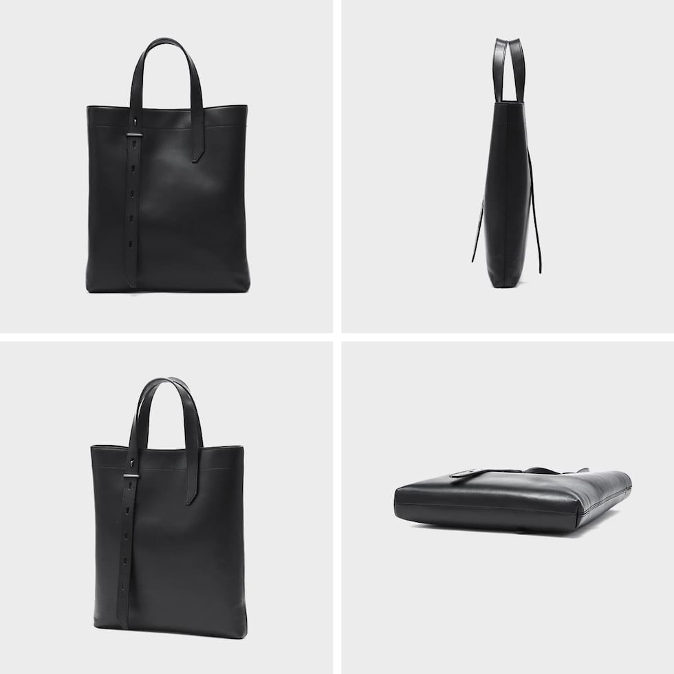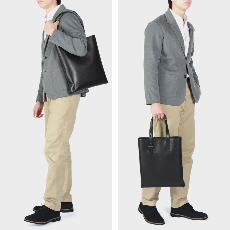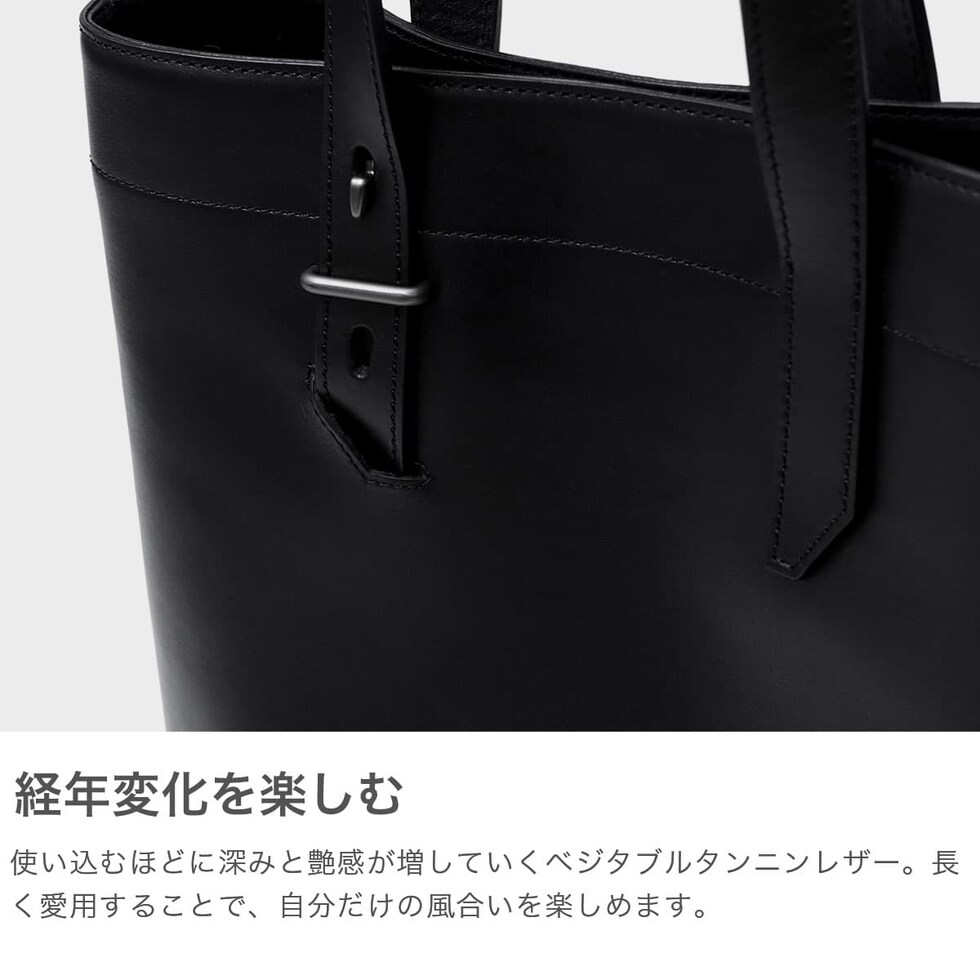 | 本格レザーの スマートトートバッグ 2種類のベジタブルタンニンレザーを使用したトートバッグ。ハンドルは長さ調整が可能、剣先はスリットに収納することもできるのがデザインのポイントです。経年変化を楽しめる本格的なレザーと、マットな金属パーツがクールで男らしい印象を作ります。 |