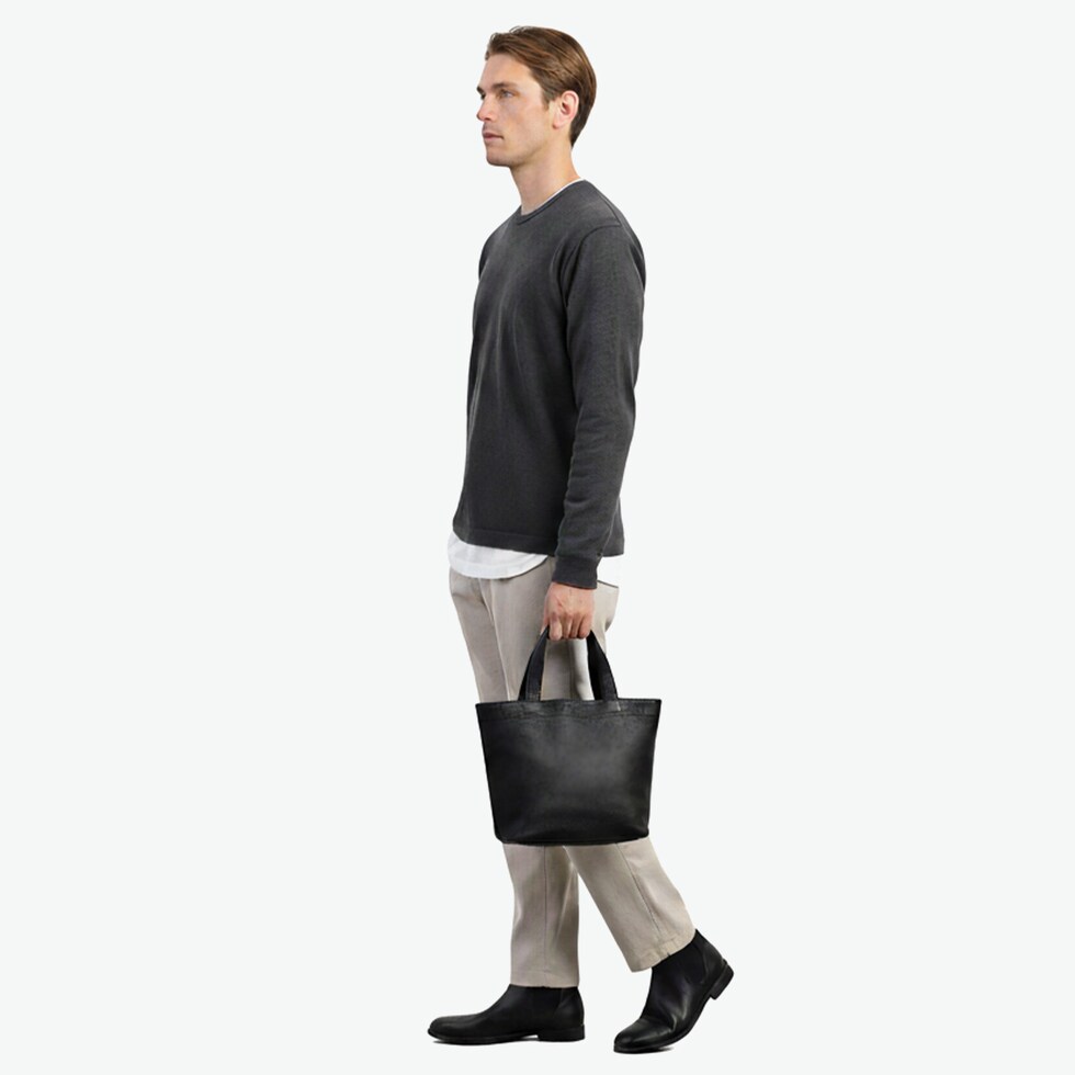 | ラフな質感が魅力の 軽やかレザートート HERGOPOCHの使用するレザーで最もソフトなシュリンクレザーを使用した『TC』シリーズのトートバッグ。休日やちょっとしたお出かけにちょうど良い容量で、マチがしっかりあり見た目以上の収納力を確保。くたっとしたレザーの質感がラフな印象を演出しつつ、布バッグのように軽く日常使いに最適です。ミニマルなデザインと落ち着いたカラーで、ユニセックスに楽しめるアイテムです。 |