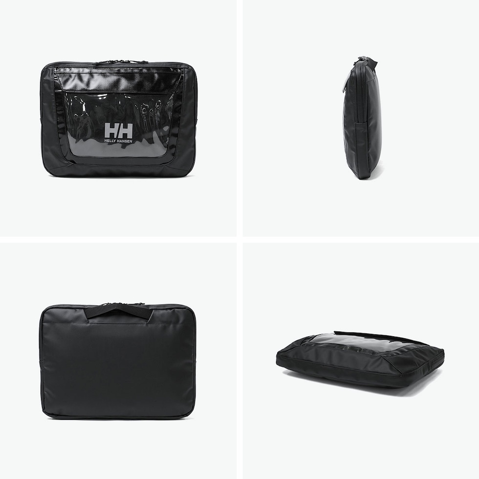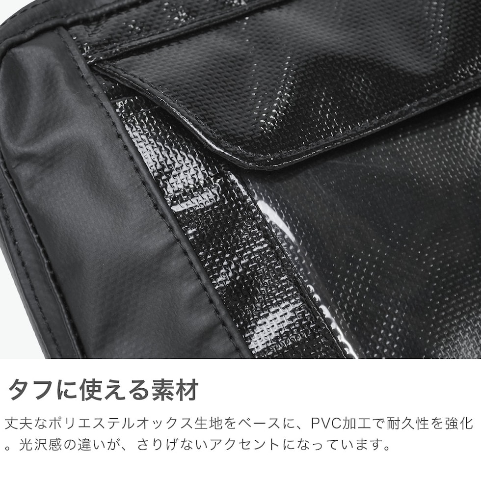 PCスリーブバッグ フロントに配した大きなクリアウィンドウがアイコニックなPCスリーブバッグ。バッグインバッグとしてはもちろん、ハンドル付きのため単体でも使えるアイテム。メイン生地には丈夫なポリエステルオックス生地にPVC加工を施すことで耐久性を高めています。生地の光沢感のある強い面をフロントパネルに、サイドパネルには控えめな光沢の面を使い、さりげない遊び心をプラスしました。14インチ程度までのPCに対応できるサイズで、ガジェット類やドキュメントもまとめて収納いただけます。 |