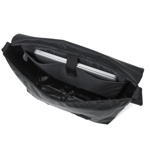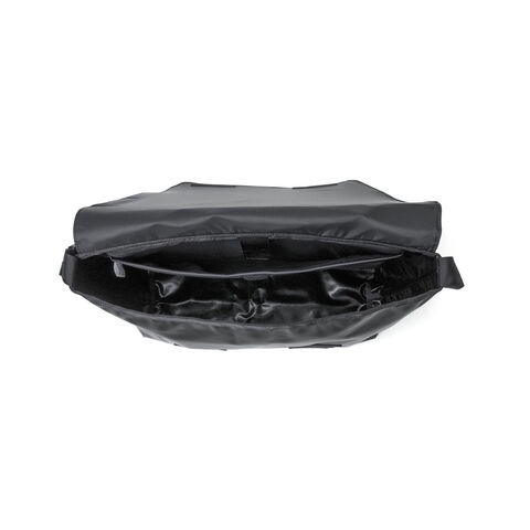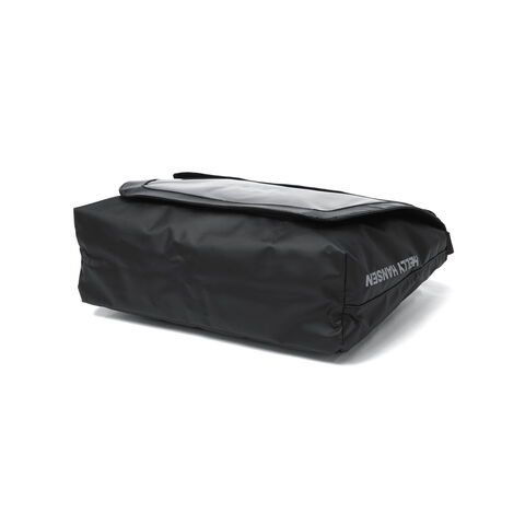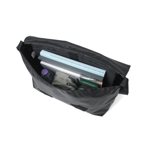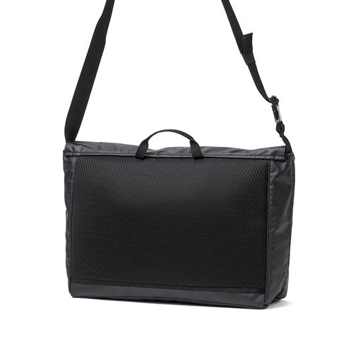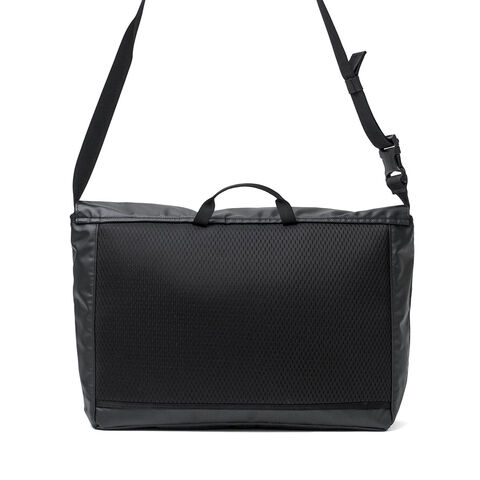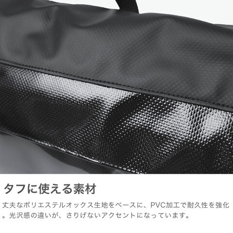 目を引くデザイン フロントに配した大きなクリアウィンドウがアイコニックなショルダーバッグ。通勤や通学などのデイリーユースがしやすいサイズ。メイン生地には丈夫なポリエステルオックス生地にPVC加工を施すことで耐久性を高めています。生地の光沢感のある強い面をフロントパネルに、サイドパネルには控えめな光沢の面を使い、さりげない遊び心をプラスしました。シンプルながらもPCスリーブを設けるなど、日常に馴染むデザインとなっています。 |