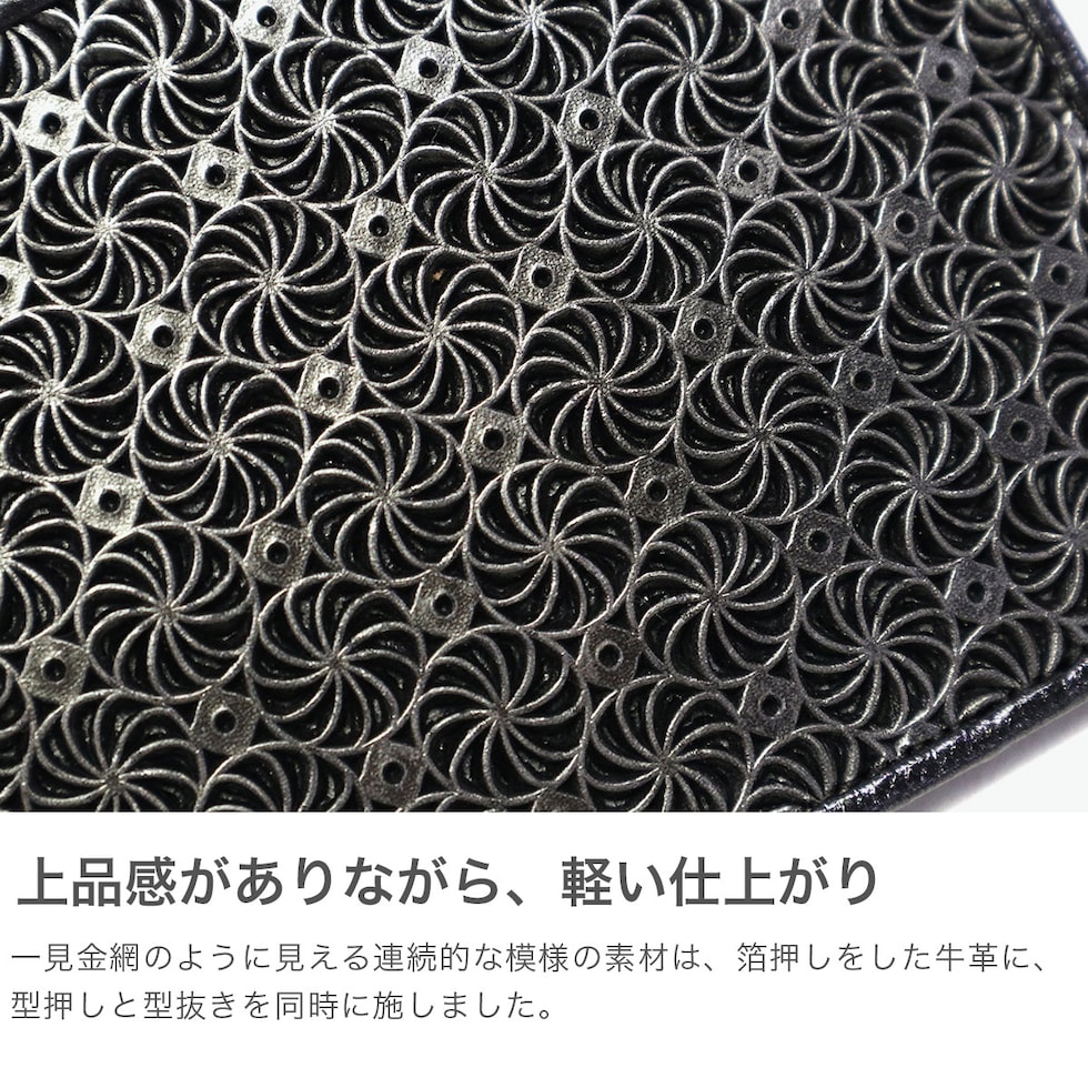 華やかな名刺入れ 独特なスクリューデザインが人気の『GIRASOLE/ジラソーレ』シリーズの名刺入れ。牛革に型押しと型抜きを施した、上品でいて軽やかな仕上がりが特徴です。スリムな見た目ながらも収納力があり、容量が多くても型崩れしにくい設計となっています。 |