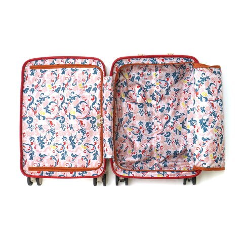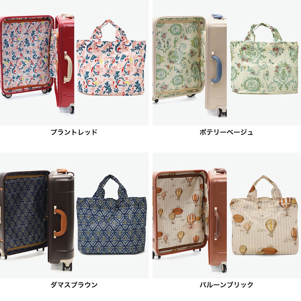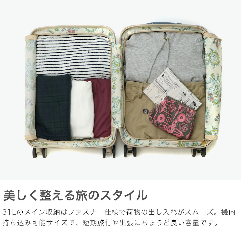 トランク風スーツケース クラシックなトランク風デザインのファスナータイプスーツケース『Notre/ノートル』の、3~4泊程度に対応した31Lの機内持ち込みサイズです。内装には本体カラーごとに異なる抗菌加工を施したプリント生地を採用。ケースを開くたびに気分が華やぐ可愛さと上品さを兼ね備えたデザインに加え、機能性にも優れたアイテムとなっています。 |