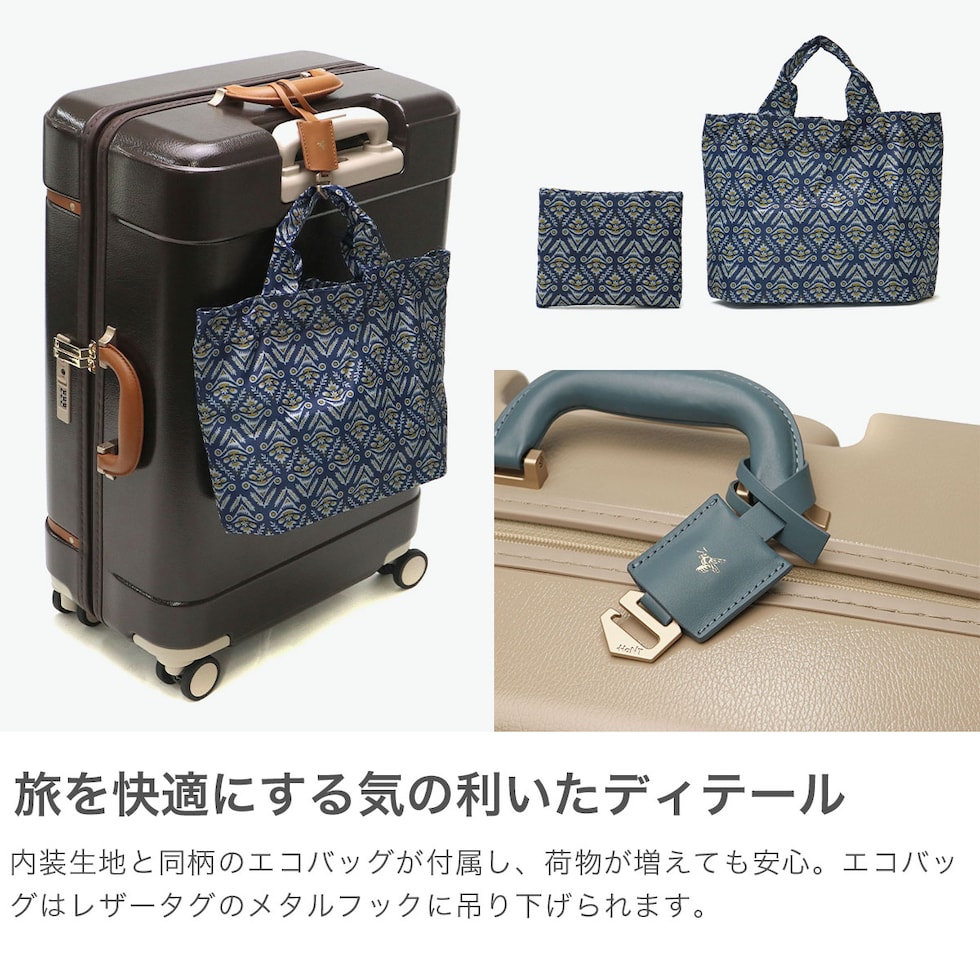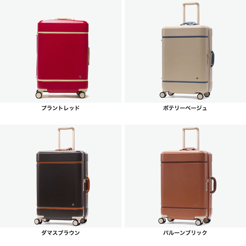トランク風デザイン クラシックなトランク風デザインのファスナータイプスーツケース『Notre/ノートル』の、4~5泊程度に対応した50Lサイズです。内装には本体カラーごとに異なる抗菌加工を施したプリント生地を採用。ケースを開くたびに気分が華やぐ可愛さと上品さを兼ね備えたデザインに加え、機能性にも優れたアイテムとなっています。 |