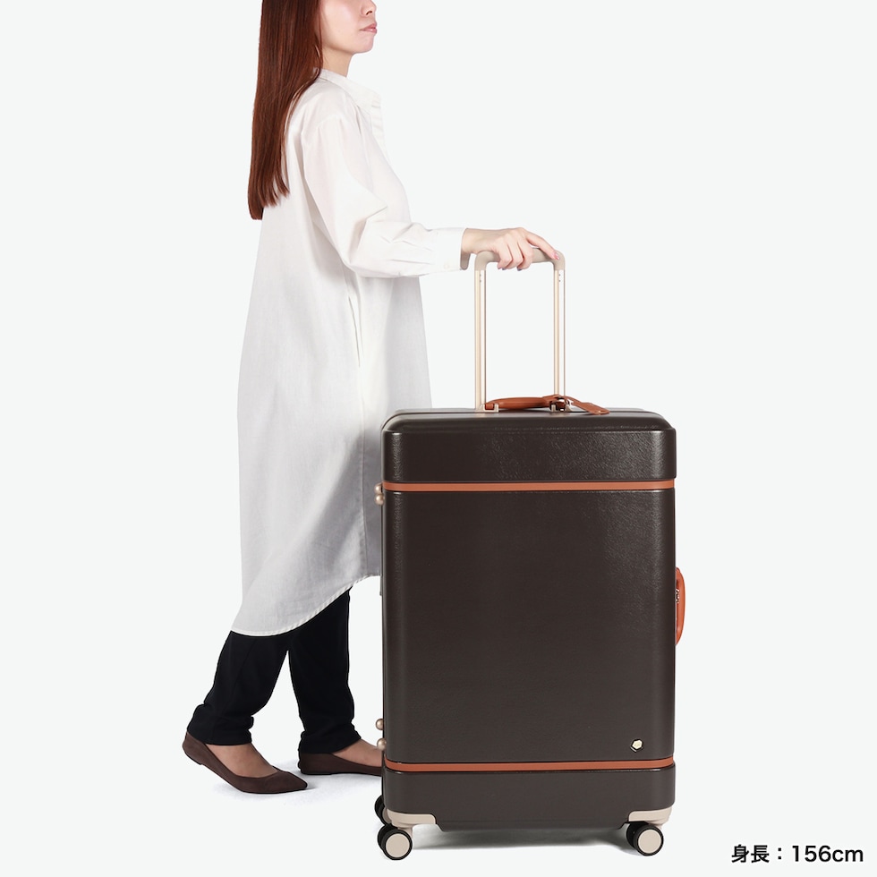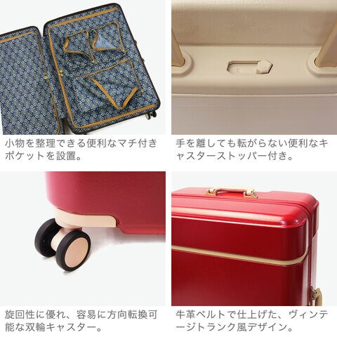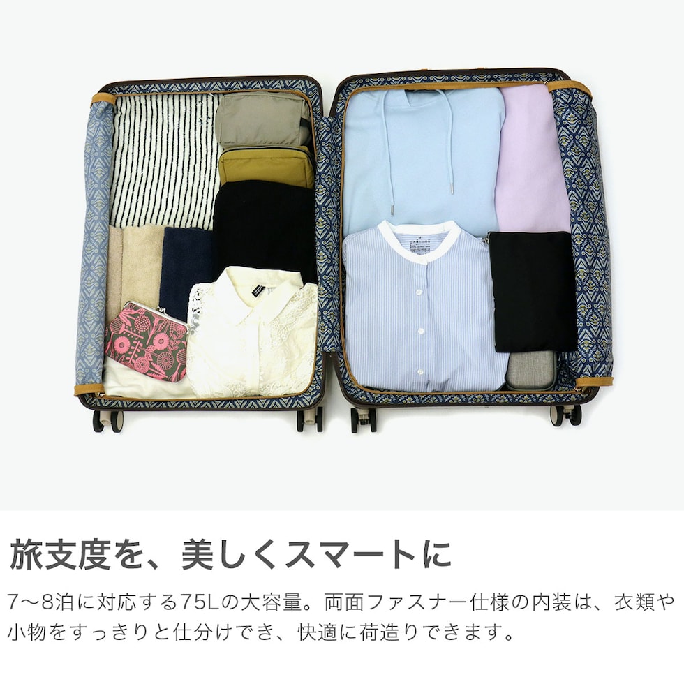 ヴィンテージトランク風 クラシックなトランク風デザインのファスナータイプスーツケース『Notre/ノートル』の、7~8泊程度に対応した75Lサイズです。内装には本体カラーごとに異なる抗菌加工を施したプリント生地を採用。ケースを開くたびに気分が華やぐ可愛さと上品さを兼ね備えたデザインに加え、機能性にも優れたアイテムとなっています。 |