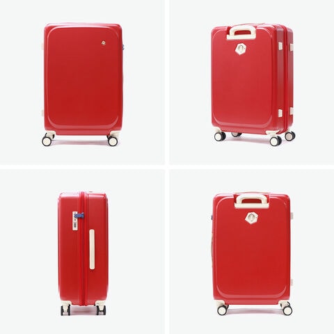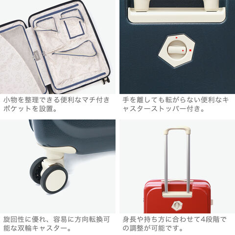 | 旅がもっとワクワクする 機能満載のキャリー 少しレトロな雰囲気と、レザー調のマットな質感が魅力のスーツケースシリーズ『ポルメロー』。こちらは、5~6泊程度の旅行に適した57L容量のモデルです。どんなコーデにも合わせやすいシンプルな本体カラーと可愛い内装デザインで、旅をもっと楽しくしてくれます! |