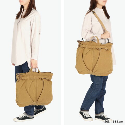 | 風合いで魅せる ミリタリーバッグ ミリタリーテイストをさりげなく漂わせるヘルメットバッグ。6号帆布の風合いが魅力的で、日常の中で自然に馴染むデザインに仕上げました。肩掛け・斜め掛け可能な使いやすさと、大容量で機能性も抜群。シンプルでありながら、どこか温かみを感じる一品です。 |