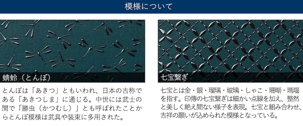 カラーとんぼ(黒×黒)|1-008、七宝繋ぎ(黒×黒)|1-179、とんぼ(緑×黒)|5-008、七宝繋ぎ(緑×黒)|5-179