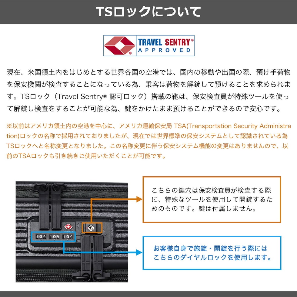 備えた大容量キャリー 7~8泊の旅行にも対応する容量約75Lの大容量スーツケース。本体にはフロントオープンポケットを搭載しており、移動中の荷物の取り出しもスムーズに行えます。また静音キャスターやキャスターストッパー、海外旅行にも安心なTSAロックを装備するなど、便利な機能が集約された頼もしい設計が魅力です。 |
