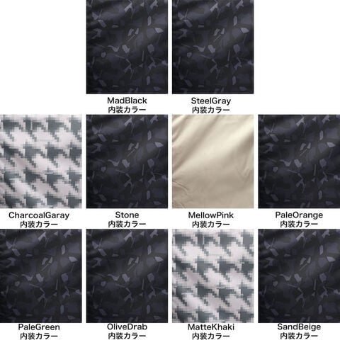 | カラー | MadBlack、SteelGray、CharcoalGray、Stone、MellowPink、PaleOrange、PaleGreen、OliveDrab、MatteKhaki、SandBeige、Vanilla、CafeLatte、SunnyYellow、DarkNavy、DeepSea、BlueShadow、ShadeBlue、LyonsBlue、PaleBlue、Cocoa |