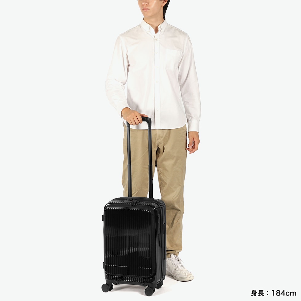 魅力のスーツケース 身軽な旅を実現する、容量38Lの小型キャリーケース。本体表面に鏡面加工を施したデザインがポイントです。14インチのPCが収まるクッション付きポケットを備えているので、ビジネス使いにも役立ち、スマートな旅を支えます。キャスターは、日乃本錠前と三菱化学が共同開発した静音キャスターを搭載し、ストレスフリーな使い心地です。 |