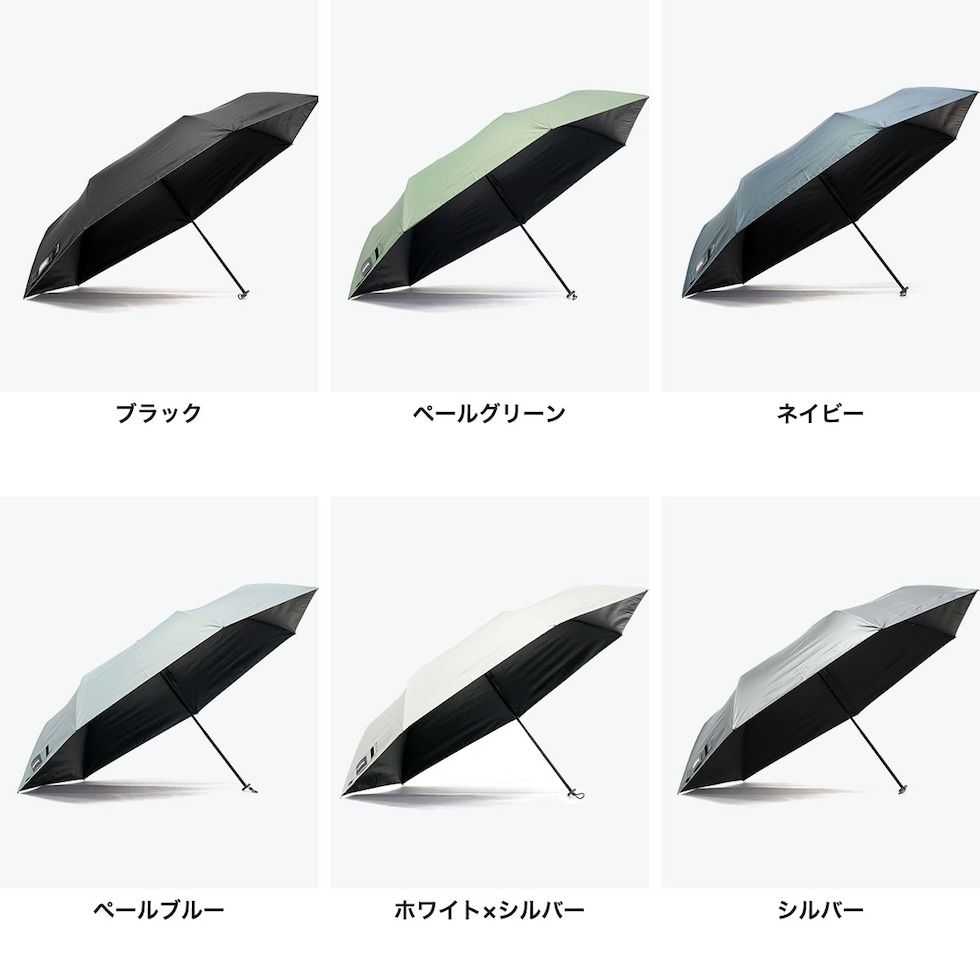 ポリエステル100%:ブラック、ペールグリーン、ネイビー、ペールブルー、ホワイト×シルバー ポリエステル%(表面シルバーコーティング):シルバー <親骨> カーボン |