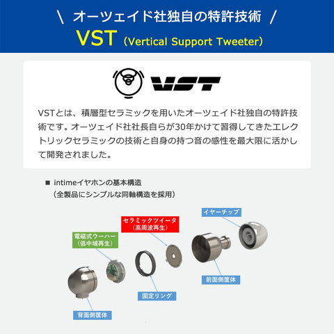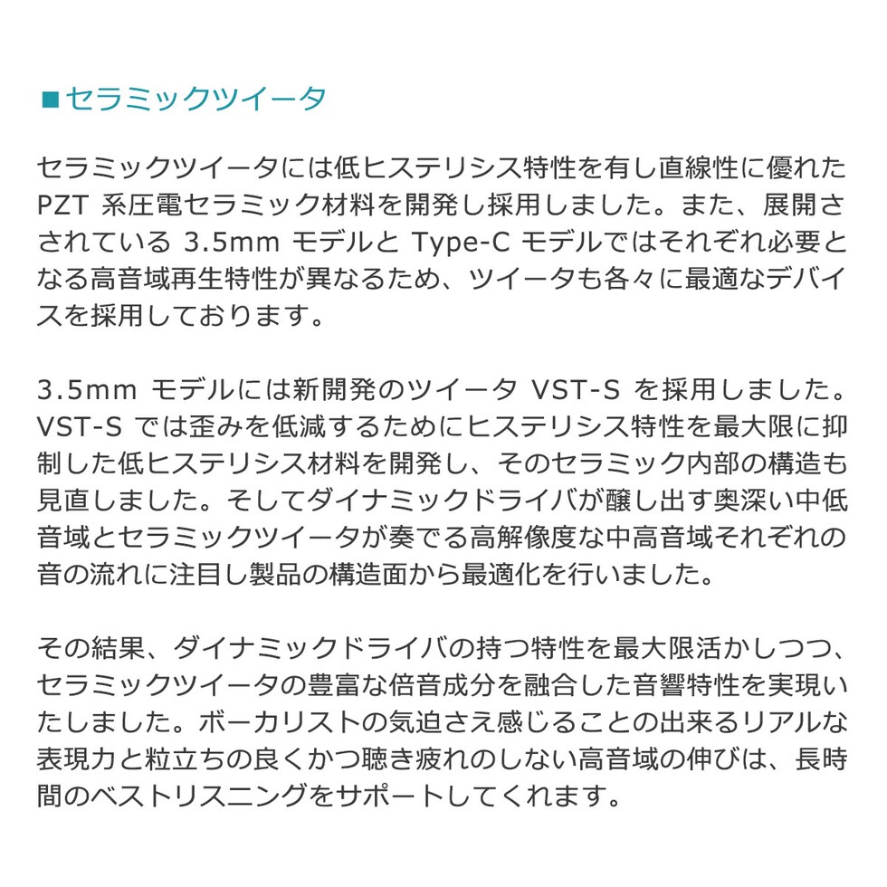 最近のトレンドにある楽曲に十分に対応出来る再生能力や更なる高音質な表現力が得られるよう、セラミックツイータに最新構造のVST-Rを取り入れ、ポータブルオーディオ愛好家の方々のニーズに幅広くお答えできる仕上がりです。