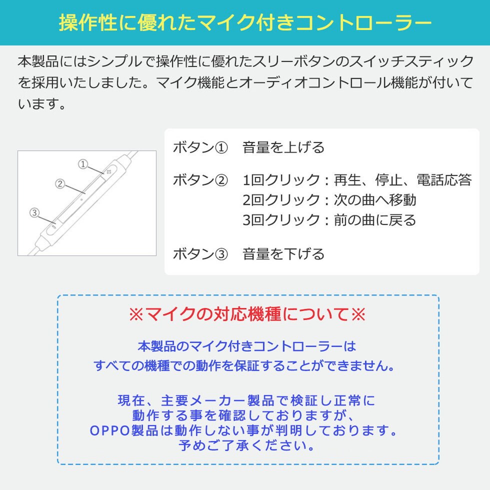 | <購入前にご確認ください> ・本製品は全てのUSBコネクタでの動作を保証するものではありません。再生ができない場合や機能が使えない場合には再生機を変えてお使いください。 ・金属アレルギーの方や、その恐れがある方は使用しないでください。 ・本製品は防水性ではありません。 ・本製品は気密性が高いため、耳に装着した際にウーハーの動く音が聞こえることがありますが、品質に影響はありません。 ・製品の色調、仕様は予告なく変更されることがあります。 ・極力実物に近い色味を再現しておりますが、モニター等の条件により画面上と実物では色味が異なって見える場合がございます。 |