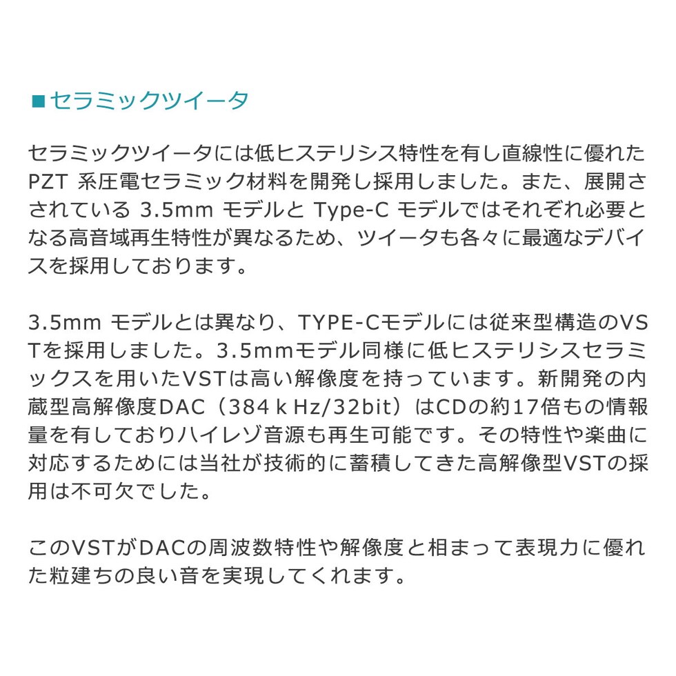 | 仕様 | <形式> ハイブリッド方式カナル型 <ウーハー> Φ10mm Dynamic Driver <ツイータ> VST <筐体材質> ステンレス筐体+樹脂筐体 <音圧レベル> 105dB/mW <再生周波数帯域> 20Hz~45kHz <インピーダンス> 22Ω <コネクタ> USB(TYPE-C) 384kHz/32bit <ケーブル> ステレオケーブル(約 1.2m) <付属品> オリジナルイヤーピースiSep02(S、MS、M、L) ※出荷時はMサイズ装着 |