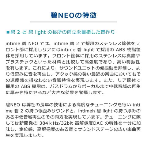 | 定位感、高解像度の音を いつでも楽しめる intimeのユニバーサルモデル「碧シリーズ」から、進化を経た「intime碧NEO」のTYPE-Cモデルが登場。 |