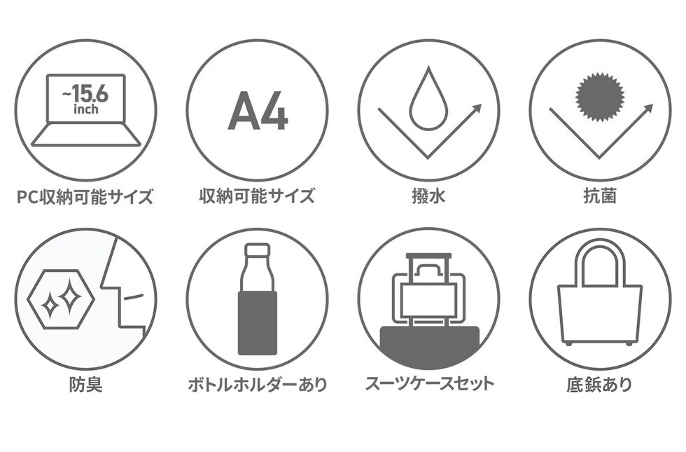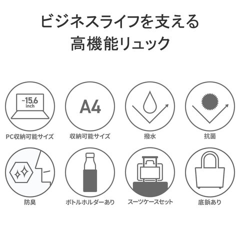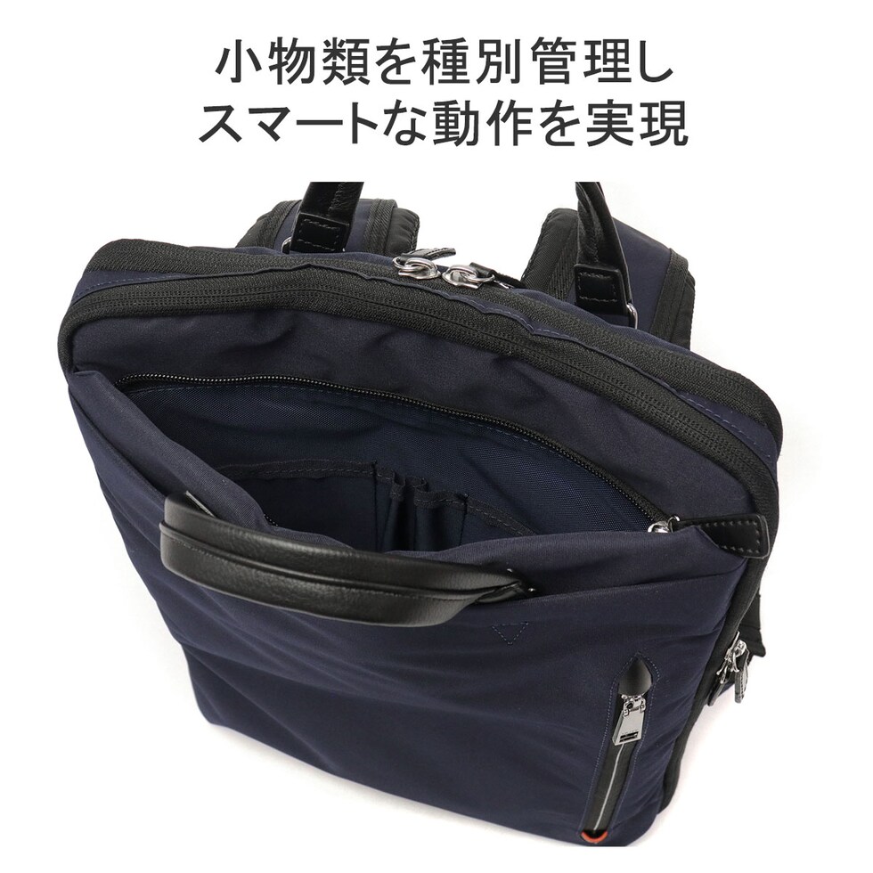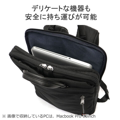 | 仕様 | <外側> PC収納×1 ジップポケット(L)×1 ジップポケット(L)×1 └ 内蔵 ポケット(S)×2 ペンホルダー×2 マグネットポケット(M)×1 <内側> ベルクロポケット(L)×1 メッシュジップポケット(M)×1 メッシュポケット(S)×2 ポケット(S)×2 ペンホルダー×2 ボトルホルダー×2 <付属品> チェストストラップ×1 |