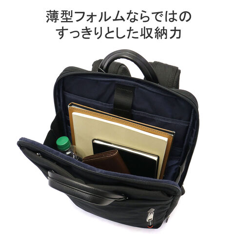 | ビジネスライフを支える 高機能リュック 毎日の通勤から出張まで、ビジネスシーンをより快適にする高機能なスリム型リュックサック。本体素材には特殊なウレタンコーティングを施すことにより、耐水性・耐久性に優れた仕上がりとなりました。必要な機能をしっかりと備えながらも本体は軽量で、かつソフトでしなやかな風合いが魅力のアイテムです。 |