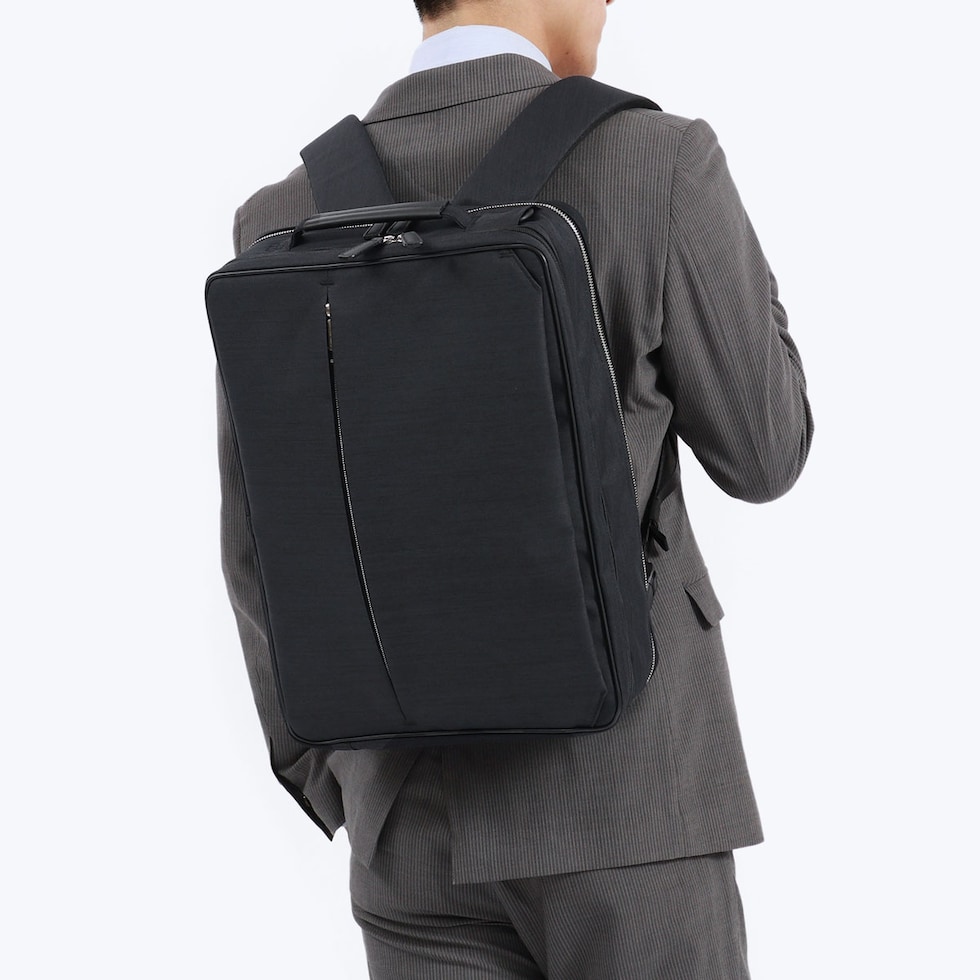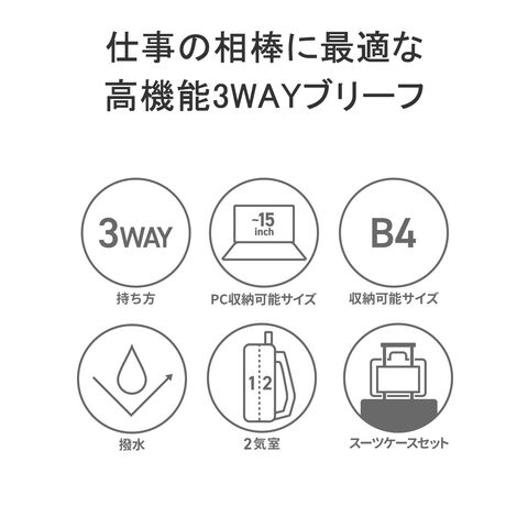 | 仕事の相棒に最適な 高機能3WAYブリーフ スッキリしたシンプルなデザインとカジュアルな素材感が魅力の「ルシェル」シリーズ。こちらは、B4サイズ対応の3WAYブリーフケースです。本体には、撥水加工を施したシャンブレー調のポリエステル生地を使用。軽く、雨の日も安心して持ち運べる仕様となっているため、デイリー使いには最適なビジネスバッグに仕上がっています。ショルダーストラップは着脱可能で、ハンドルは格納式のため、用途や使うシーンに合わせて柔軟にフォルムを変えられる点もポイントです。 |
