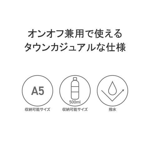 | オンオフ兼用で使える タウンカジュアルな仕様 普段使いに適したサイズ感と、ポケット類が豊富に備わっている機能的なミニショルダーバッグ。一体感のあるスッキリとしたデザインに仕上がっており、A5サイズに対応したメインルームには500mlのペットボトルが横向きにすっぽりと入るため、ちょっとしたおでかけに最適なアイテムとなっています。 |