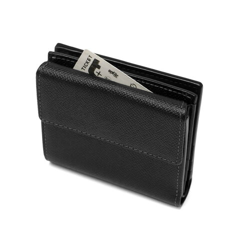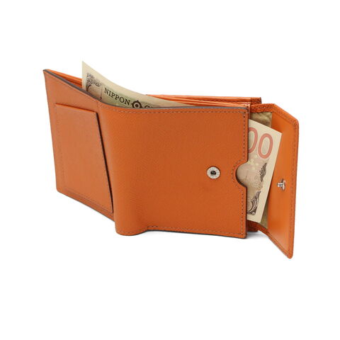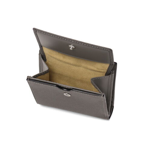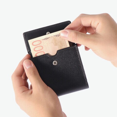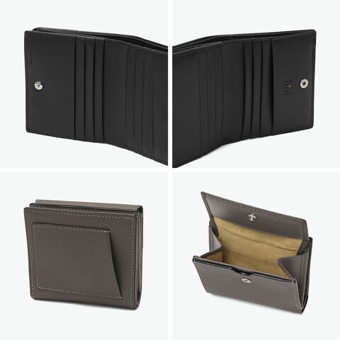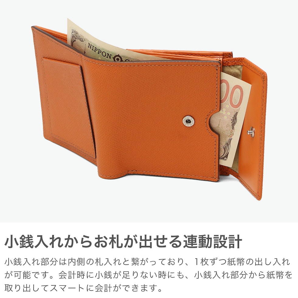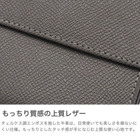コンパクトながら機能性に優れた二つ折り財布です。本体はチェルケス調のエンボス加工を施した牛革を使用し、傷が付きにくく、もっちりとしたタッチ感が魅力。外側の小銭入れと札入れが繋がっている構造により、1枚ずつ紙幣の出し入れが可能です。会計時に小銭が足りない時にも、小銭入れ部分から紙幣を取り出してスマートに会計ができます。計10枚分のカード収納力も兼ね備えた実用的なアイテムです。