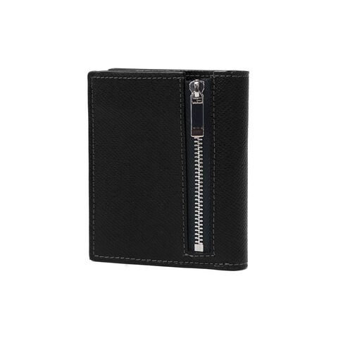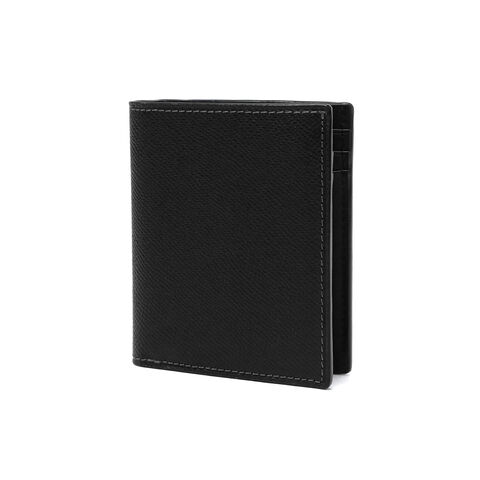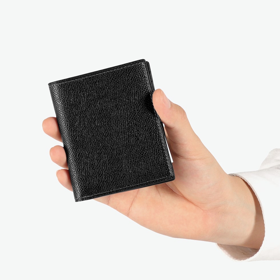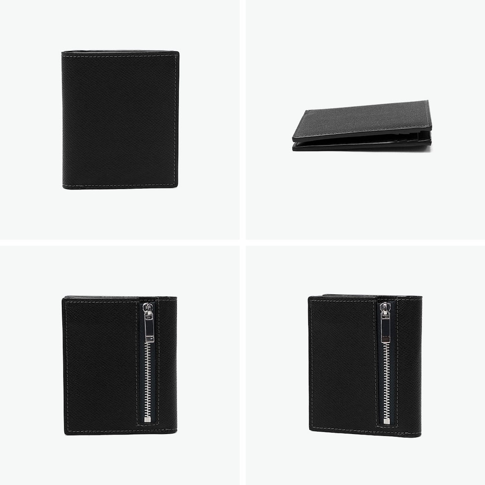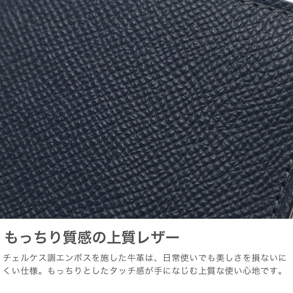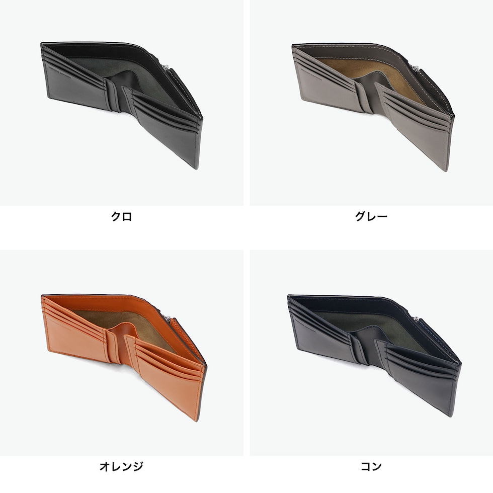 スマートなサイズ感 スリムでコンパクトな二つ折り財布です。本体はチェルケス調のエンボス加工を施した牛革を使用し、傷が付きにくく、もっちりとしたタッチ感が魅力。紙幣がジャストで収まるサイズ感で、札入れ・カードポケットに加え、外側には片マチ付き小銭入れを装備。キャッシュレス派に最適な、スマートな携帯性を実現したアイテムです。 |