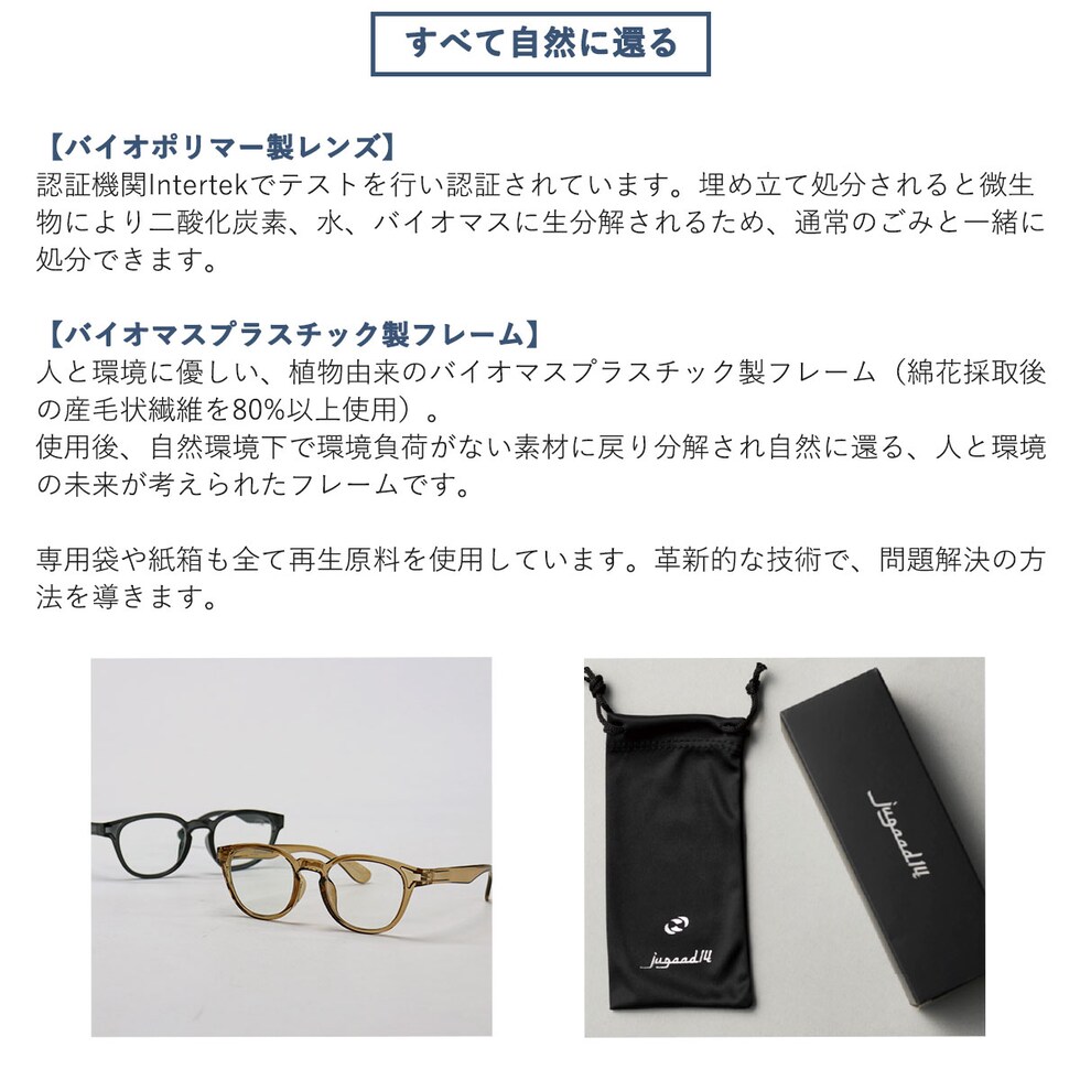 | 素材 | <レンズ> Intertek認証の生分解性バイオポリマー <フレーム> バイオマスプラスチック |