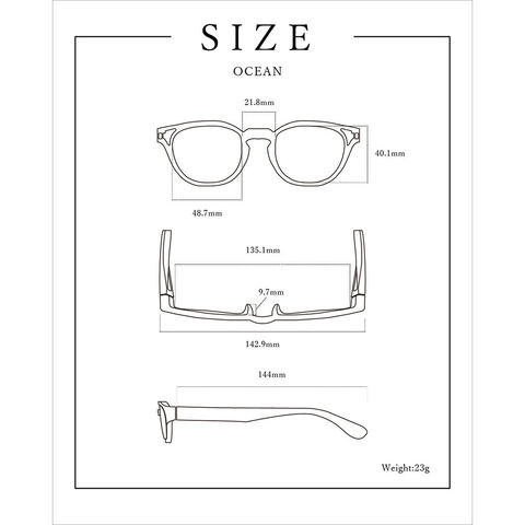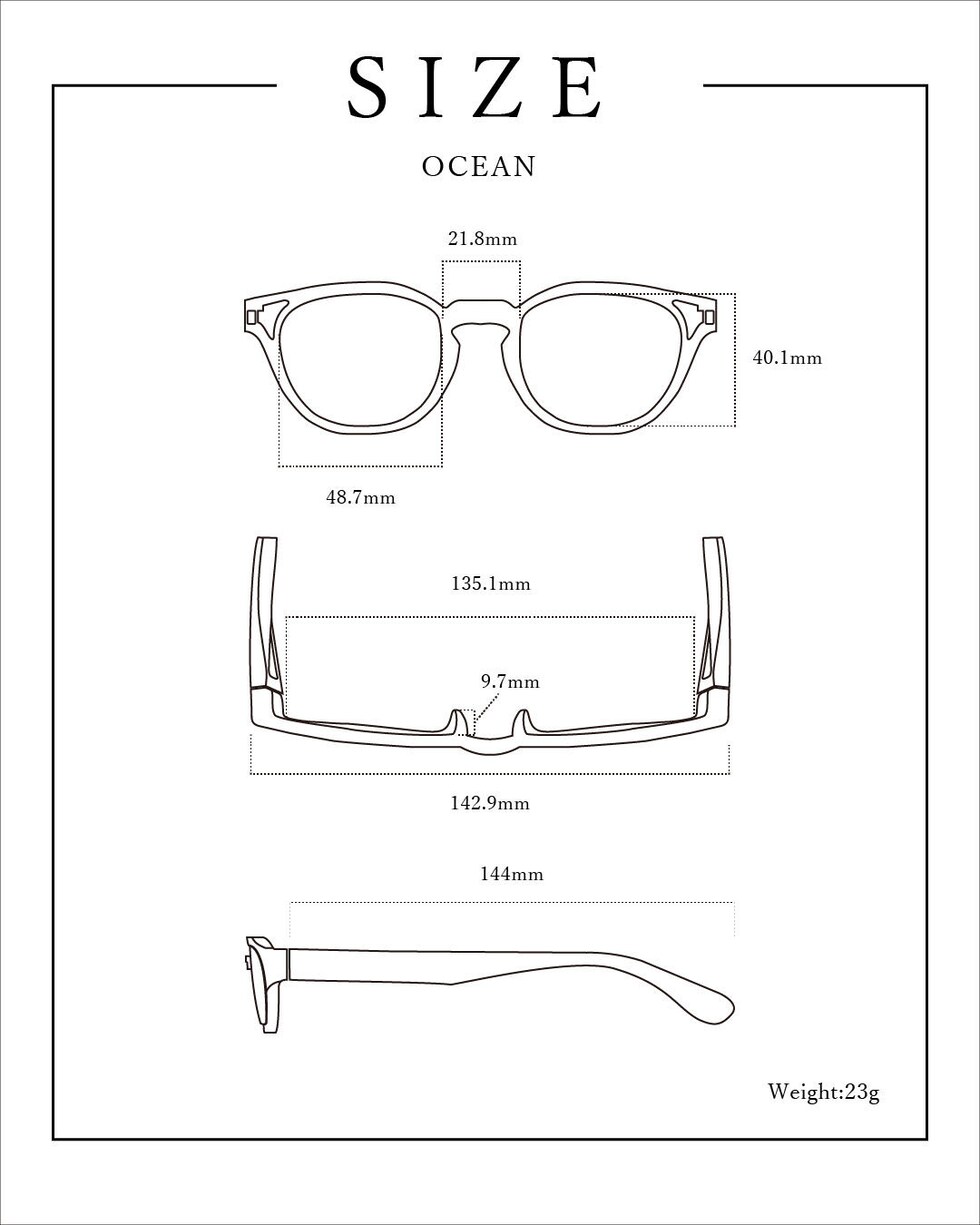 | サイズ | <レンズ> 幅:約 48.7(mm) 高さ:約 40.1(mm) <フレーム> ブリッジ幅:約 21.8(mm) 鼻あて高さ:約 9.7(mm) フレーム幅(内):約 135.1(mm) フレーム幅(外):約 142.9(mm) テンプル長:約 144(mm) ※商品により、若干の個体差が生じます。 |