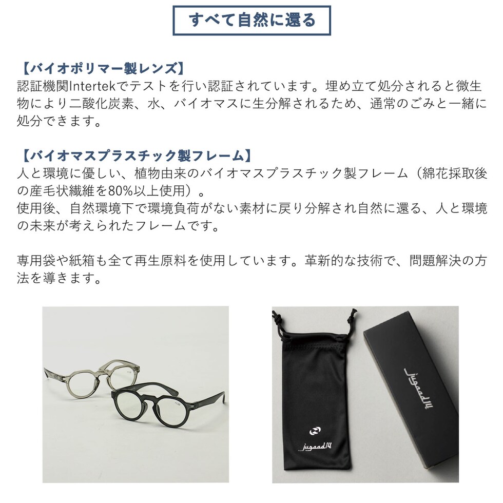 | 素材 | <レンズ> Intertek認証の生分解性バイオポリマー <フレーム> バイオマスプラスチック |