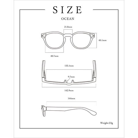 | サイズ (約) | <レンズ> 幅:約 48.7(mm) 高さ:約 40.1(mm) <フレーム> ブリッジ幅:約 21.8(mm) 鼻あて高さ:約 9.7(mm) フレーム幅(内):約 135.1(mm) フレーム幅(外):約 142.9(mm) テンプル長:約 144(mm) ※サイズ・重量は当店計測値となります。 商品により、若干の個体差が生じます。 |
