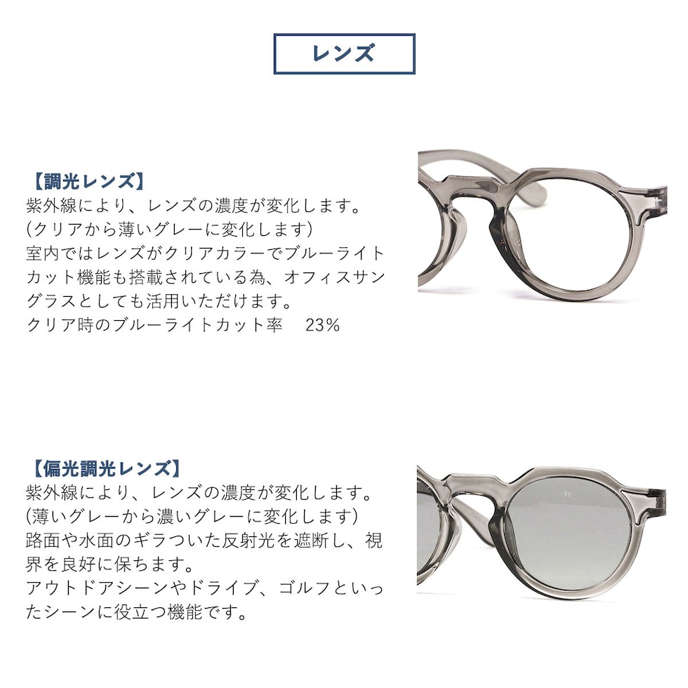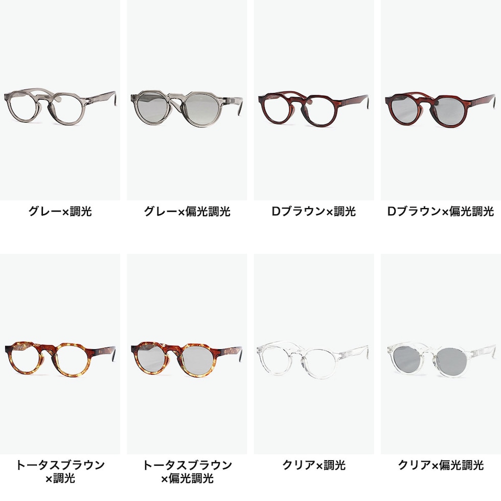 | カラー | ブラック×調光(BLK5)、ブラック×偏光調光(BLK7)、ディープブラック×調光(DBLK5)、ディープブラック×偏光調光(DBLK7)、トータス×調光(MULTI5)、トータス×偏光調光(MULTI7)、グレー×調光(GRY5)、グレー×偏光調光(GRY7)、Dブラウン×調光(DBRN5)、Dブラウン×偏光調光(DBRN7)、トータスブラウン×調光(2MULTI5)、トータスブラウン×偏光調光(2MULTI7)、クリア×調光(CLR5)、クリア×偏光調光(CLR7) |