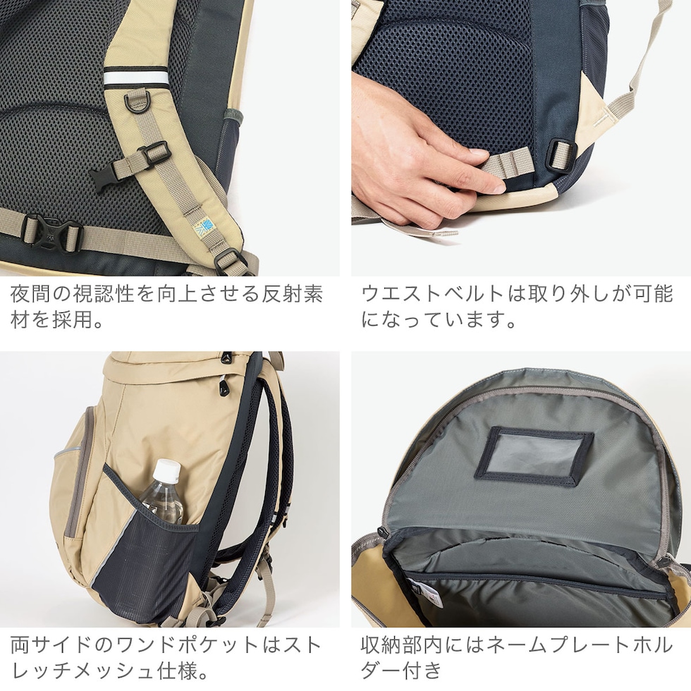 子供から女性まで使える小型リュック。コンパクトながら、A4サイズ対応で必要な荷物がすっきり収まります。夜間の視認性を高める反射素材やセーフティバックルを使用したチェストベルトなど、安全性にも配慮した仕様。登山やトレッキングなどのアウトドアシーンに活躍する機能を多数搭載しています。