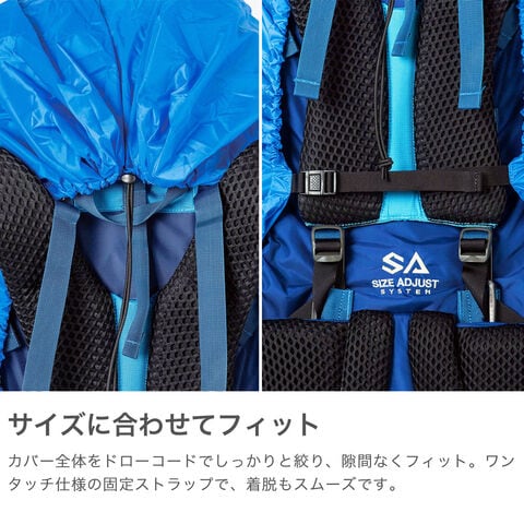 | サイズ (約) | <本体> W61×H105(cm) <パッカブル> W14.5×H13×D6(cm) <リュックの適応サイズ> 60~80(L) ※サイズ・重量は当店計測値となります。 商品により、若干の個体差が生じます。 ※当店のサイズ計測方法はこちら |