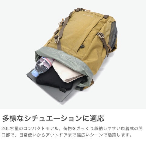 軽快トレッキングが叶う 機能充実の小型ボディ コンパクトな小型モデルながら、20L容量で多彩な機能を備えたバックパック。パッド入りヒップベルトには便利なポケットを装備し、ワンドポケットやフロントポケット、ポールキャリアなどアウトドアに嬉しい機能が充実。雨蓋付きで荷物をしっかり守ります。背面パッドは取り外して手洗いでき、登山やトレッキングに最適な快適仕様です。 |