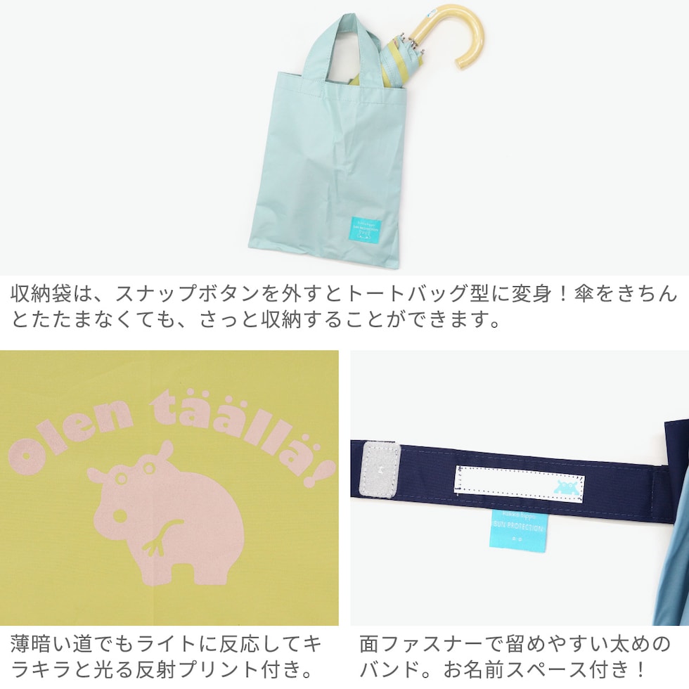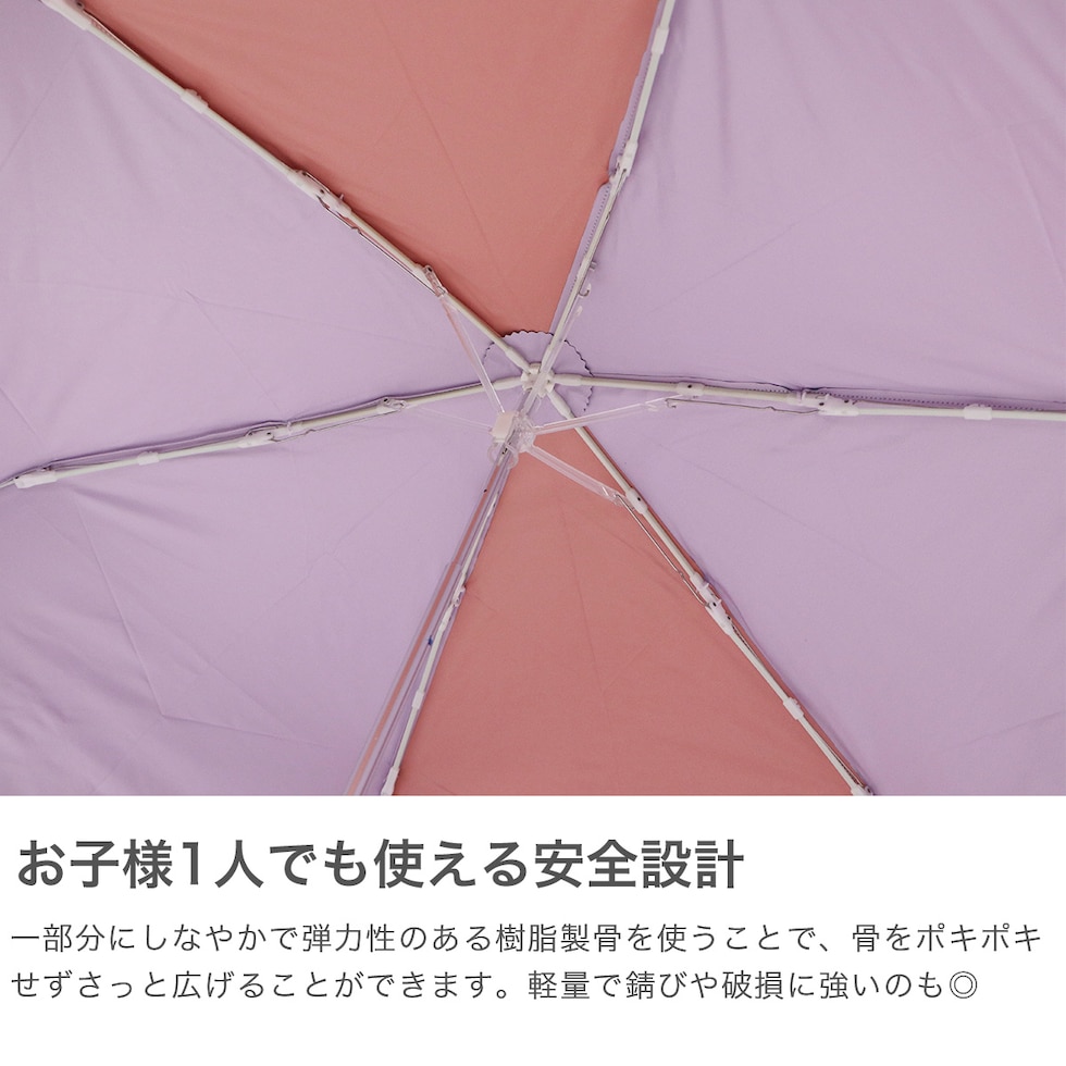 真夏の日差し・突然の雨をしっかりブロックできる、晴雨兼用の折りたたみ傘。開閉は指を挟みにくい「安全手開き構造」で、お子様でも安心してお使いいただけます。コンパクトなサイズ感で、ランドセルやリュックにもすっきり収納可能。重さは約210gと軽量で、持ち運びも楽々!さらに出し入れがしやすいトート型の収納袋付きで、扱いやすさにもこだわりました。