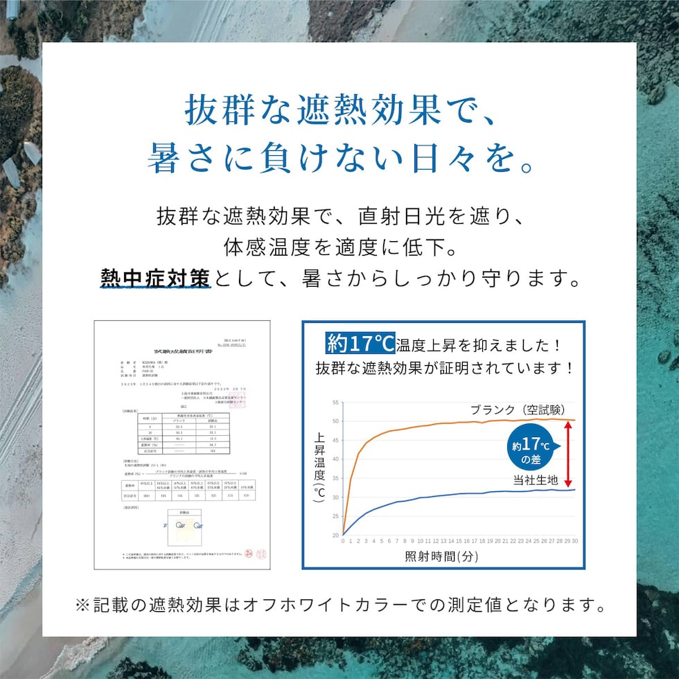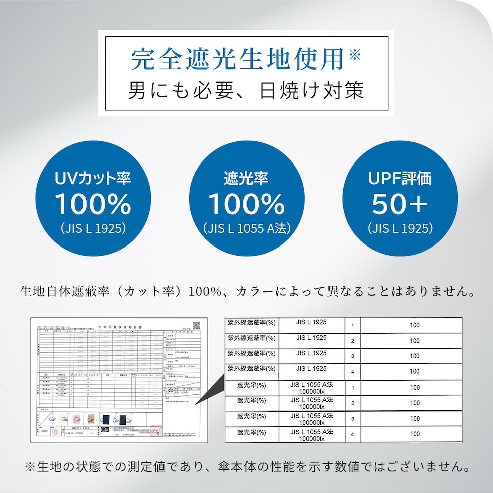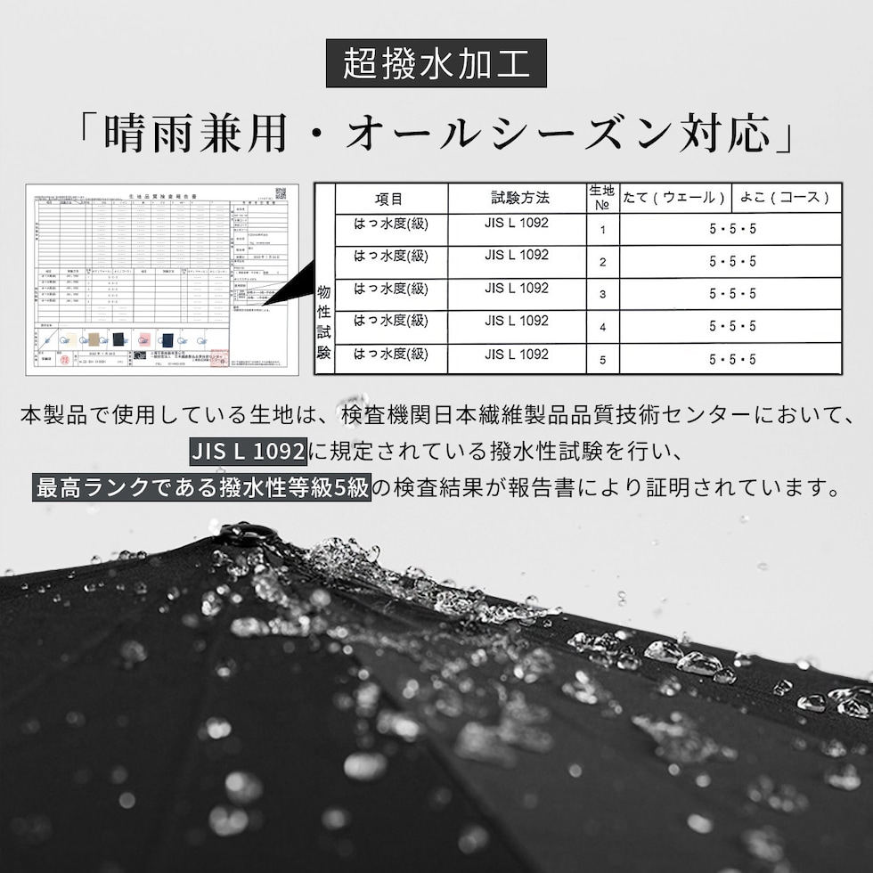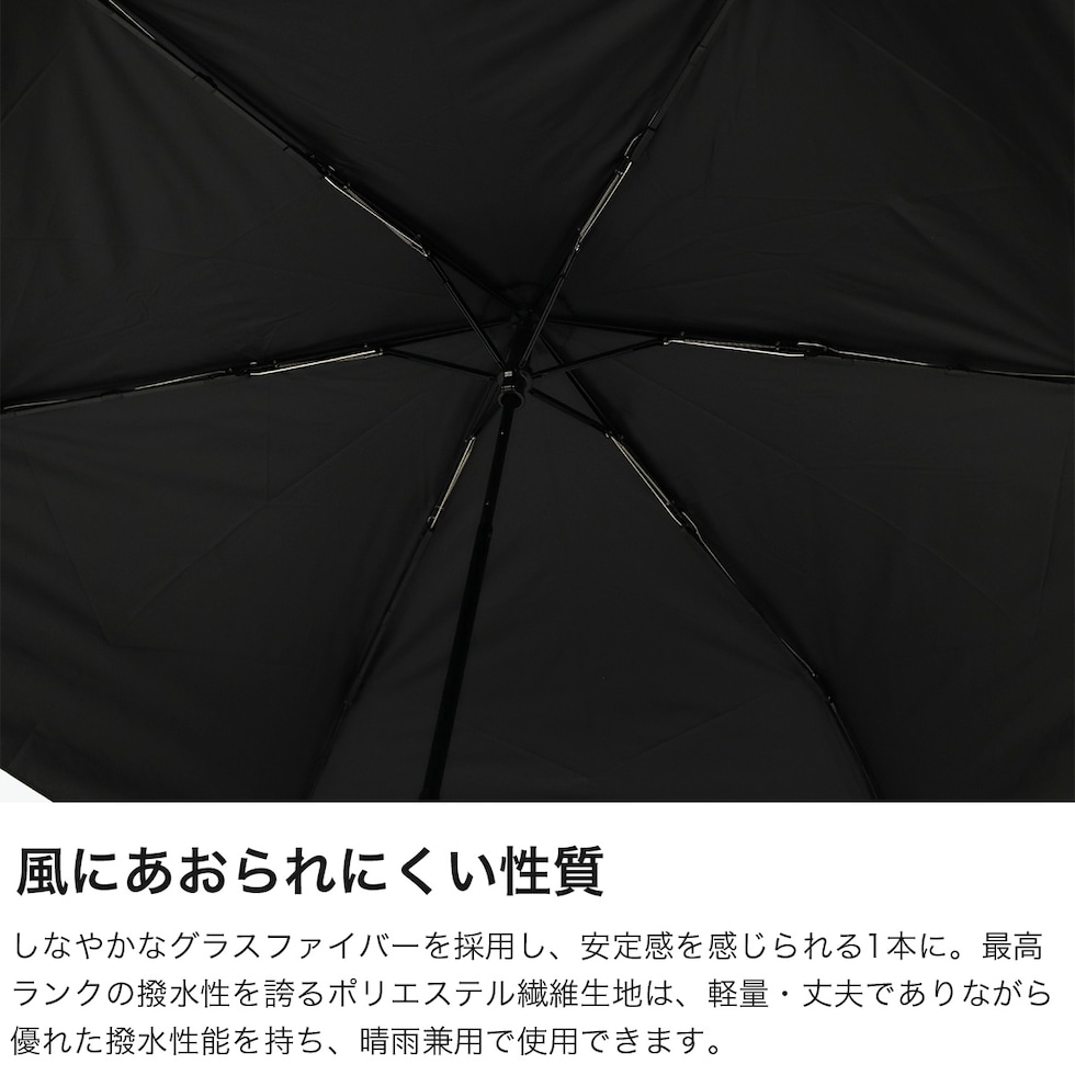 | 抜群の安定感で風に強い グラスファイバー傘 親骨には、軽量でありながら弾力性に優れているグラスファイバーを使用。非常にしなやかで、たわみながらも元に戻る性質があります。そのため、風にあおられにくく安定感は抜群。直径96cmの大きめサイズで、男性でも十分なサイズ感に仕上げました。また、「遮光率100%」「UVカット率100%」「UPF50+」「遮熱効果」と証明された最高ランクを誇る高機能な生地を使用。木陰にいるような涼しさで外出も楽しくなります! |