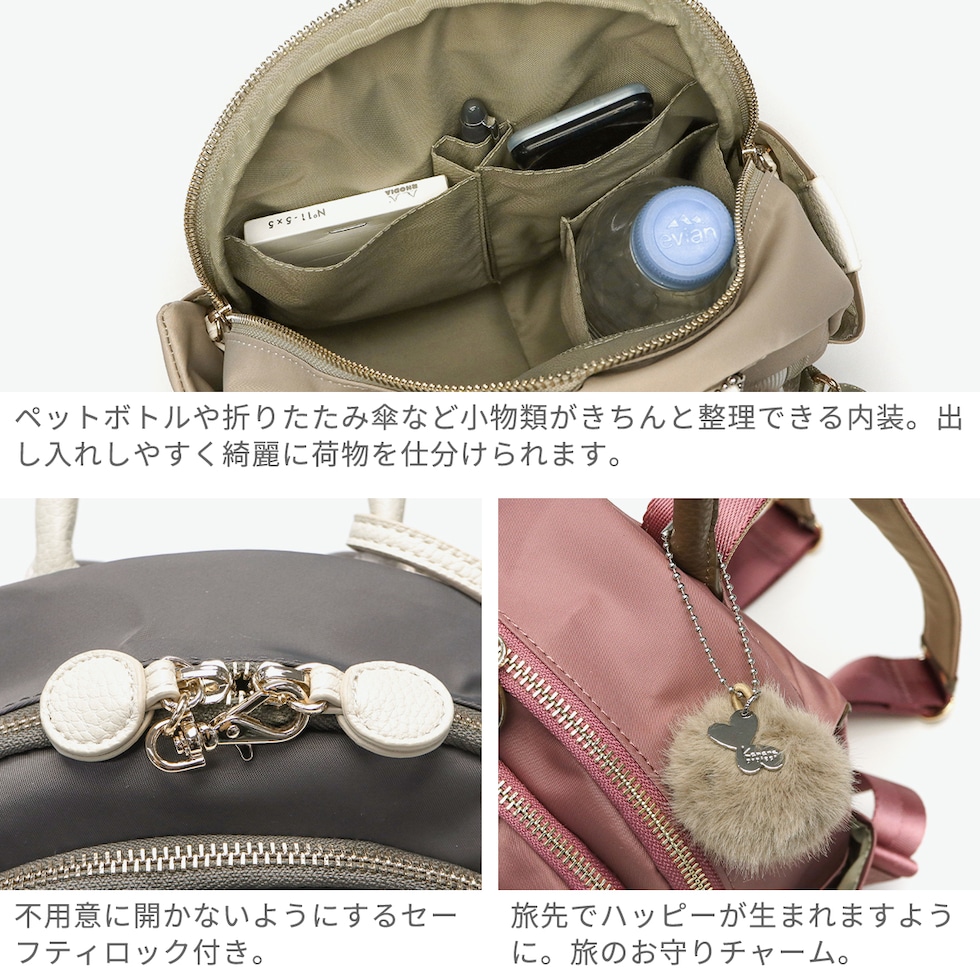 旅の達人・竹内海南江さんの想いをカタチにしたバッグシリーズ『マルマールバッグ/PJ-17』の6L容量のリュックサックです。ベーシックなラウンド型をベースにしたシンプルなデザインに、多様な内外装ポケットやセーフティロック、ミニポーチも搭載で可愛さと機能にもこだわったアイテムです。シーズンレス・シーンレスで使いまわせる"THEベーシック"をテーマに新しい「MY定番」を提案します。