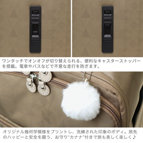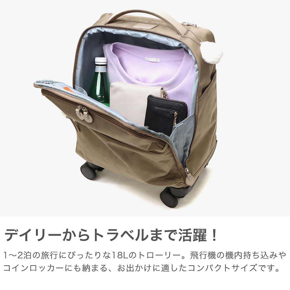 | 旅も日常も 軽やかに彩る お出かけに嬉しい充実した機能が魅力の『カナナマイトローリー』シリーズより、リミテッドデザインが登場。こちらは、日常使いにもぴったりな、上品で可愛い18Lソフトキャリーです。機内持ち込み対応の軽量ボディに、静音ダブルキャスター&ストッパー付きで快適移動をサポートします。 |