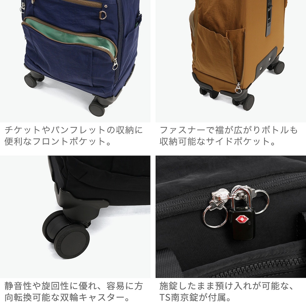 | 街にも旅にも ちょうどいい ナチュラルテイストのカジュアルデザインが魅力の『PJ8』機内持ち込み対応ソフトトローリー。18Lの軽量ボディで、1~2泊の旅行や出張はもちろん、普段のお出かけや習いごとにも活躍します。撥水加工ナイロンを採用し、急な雨にも安心。4輪キャスターとストッパー付きで走行も安定。TS南京錠付属で国内外の旅行に対応します。 |