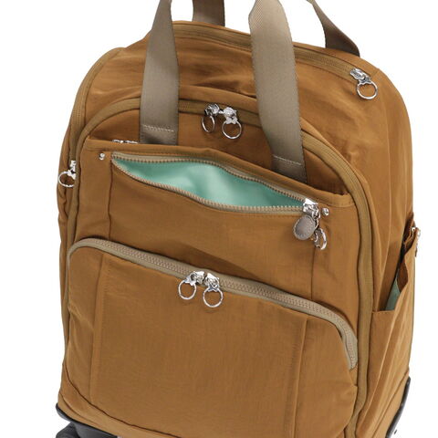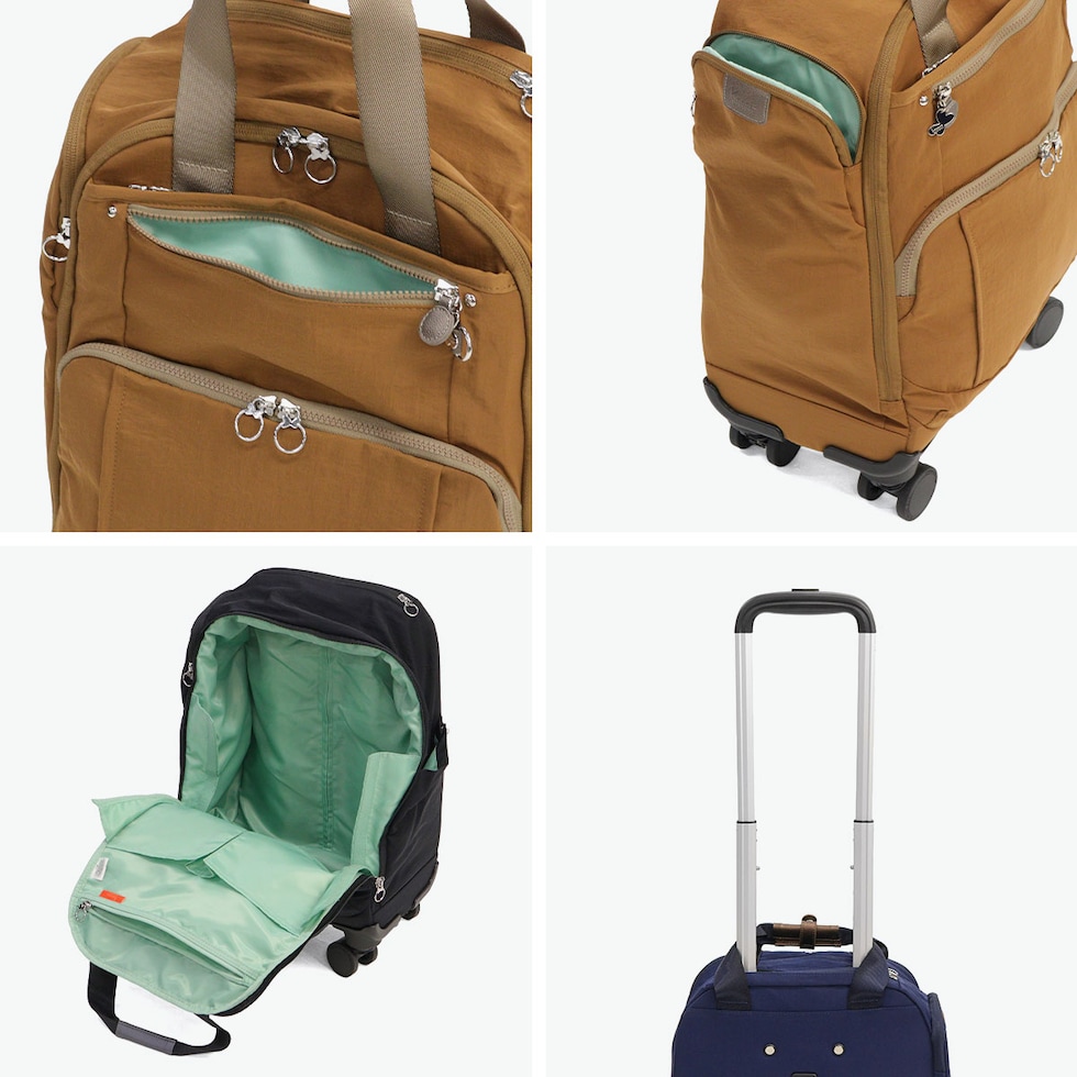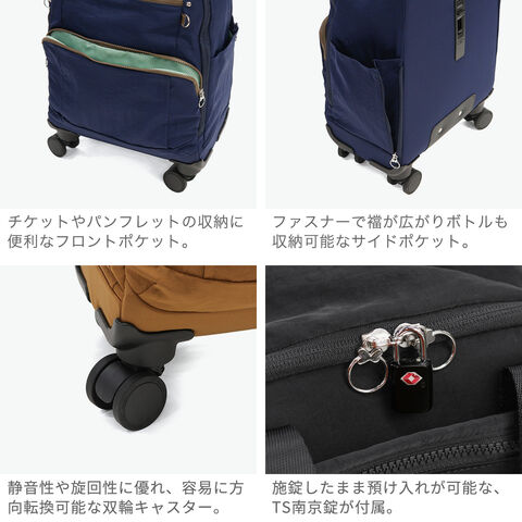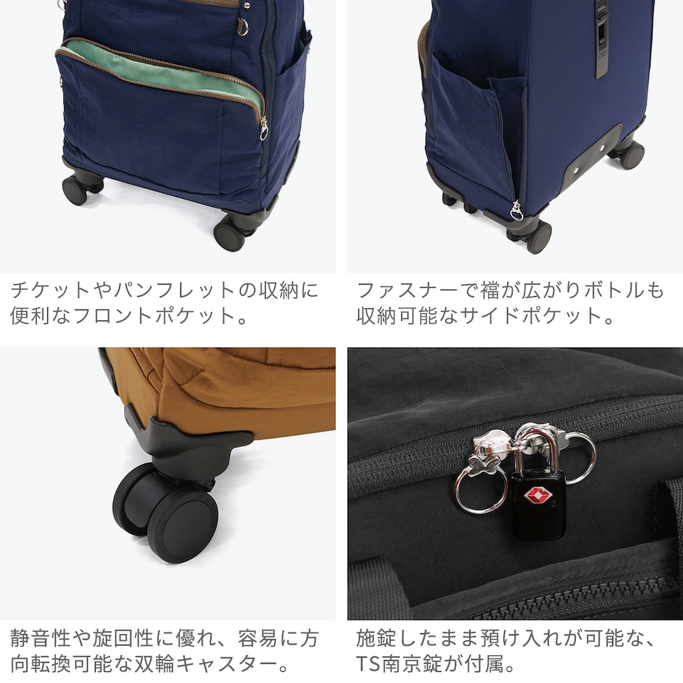 | 街にも旅にも 心地よくフィット ナチュラルな雰囲気が魅力の『PJ8』機内持ち込み対応ソフトトローリー。25Lの軽量設計で、2~3泊の旅行や出張はもちろん、デイリーのお出かけや習いごとにも幅広く活躍します。撥水加工ナイロン素材を使用し、急な雨にも配慮。4輪キャスターはストッパー付きで安定した走行を実現します。TS南京錠付属で国内外の旅行に対応します。 |
