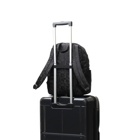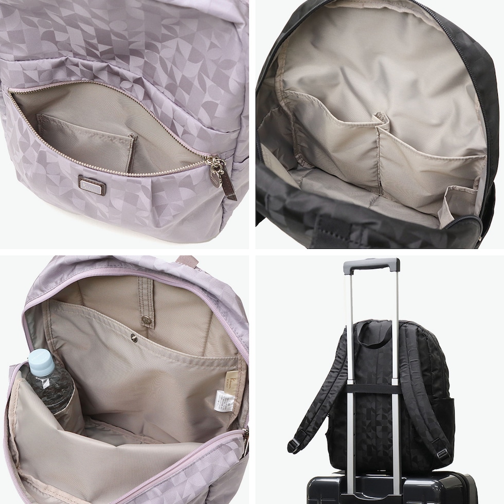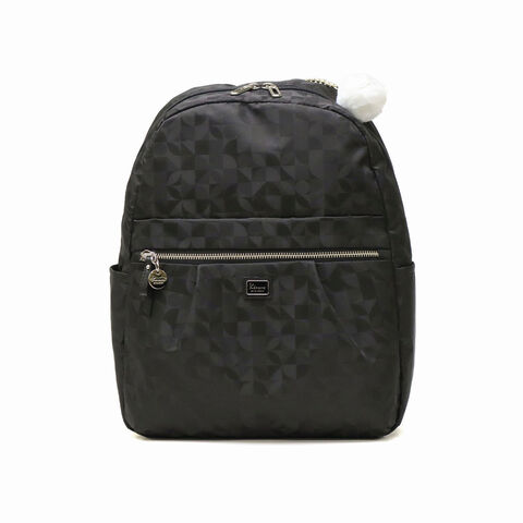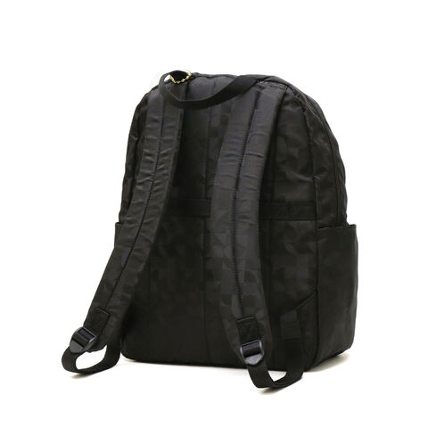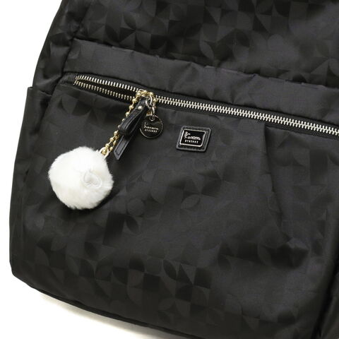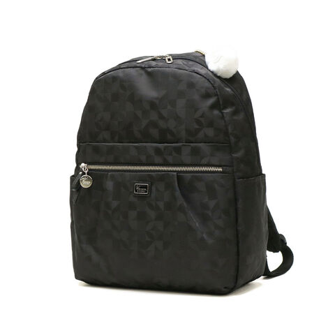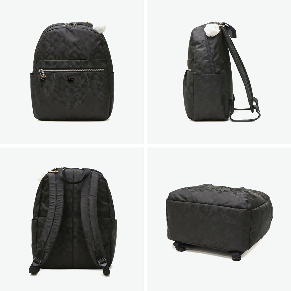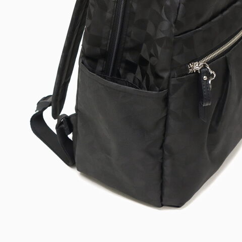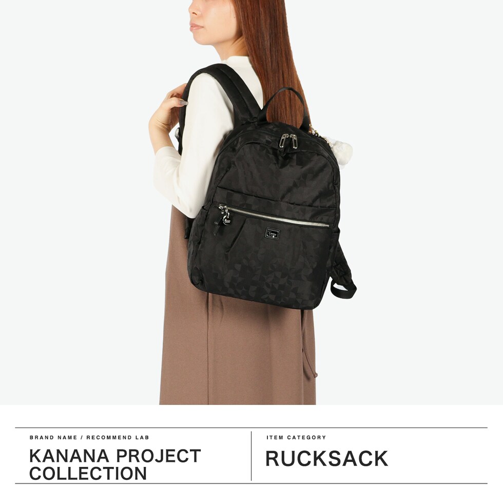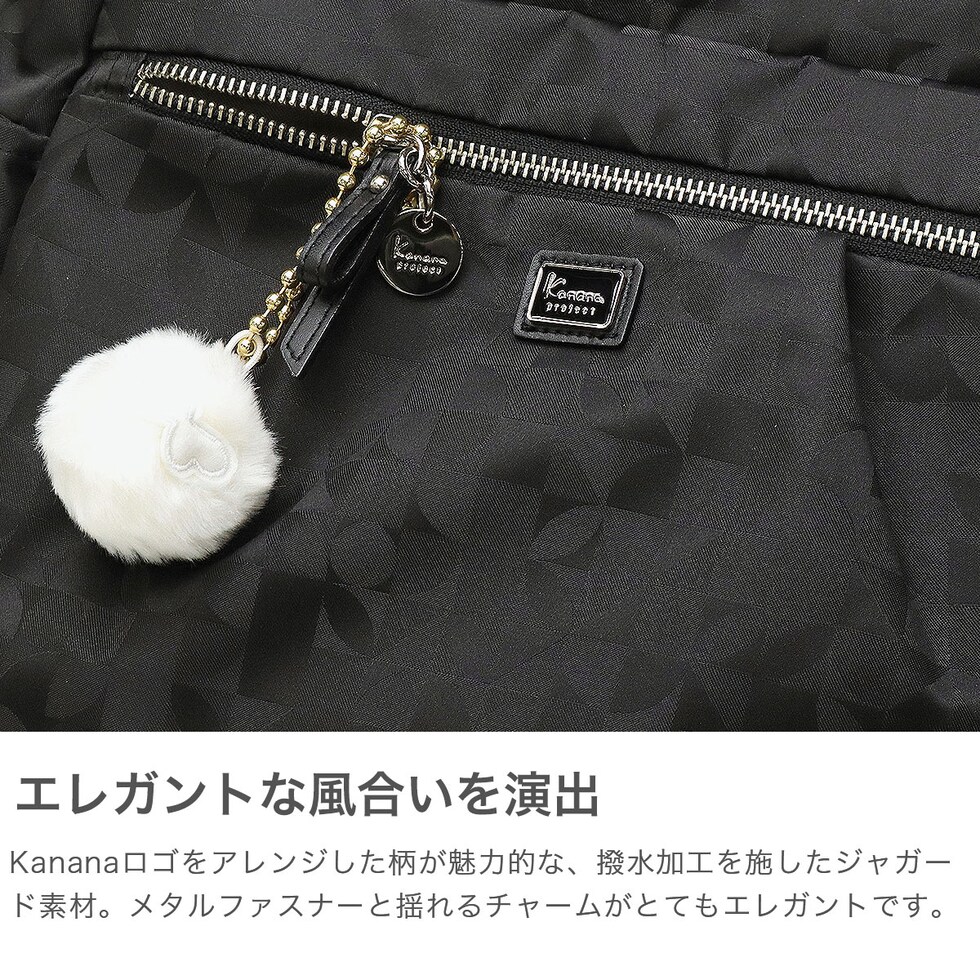 | 毎日を軽やかに きれいめリュックサック Kananaロゴをオリジナルにアレンジした柄を、上品なジャガード織で仕立てたリュックサック。前ポケットのメタルファスナーと揺れるチャームがとてもエレガントな印象です。軽量でコンパクトな見た目ながら収納力も抜群で、デイリーからトラベルまで幅広く活躍してくれます。 |