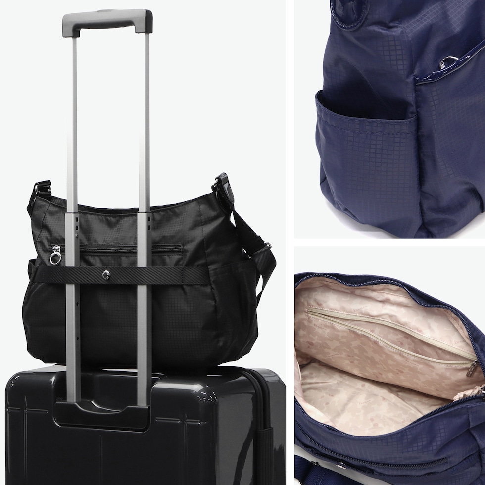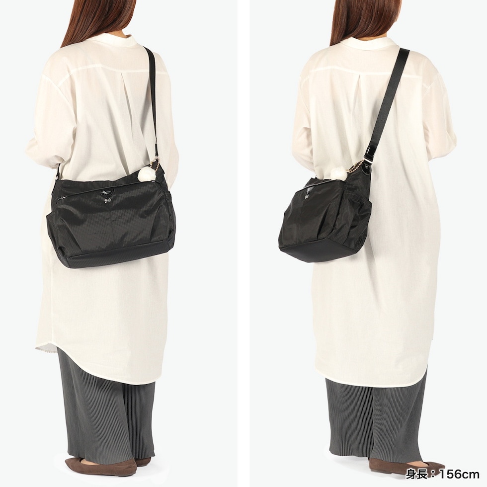 ヨコ型ショルダーバッグ スタイリングのポイントにもなる少し丸みを帯びた可愛らしいデザインと、デイリーからトラベルまで幅広く活躍する機能性を兼ね備えた『シェリ』シリーズ。こちらは8L容量のショルダーバッグです。長財布やスマホなどの身の回り品を余裕をもって収納できる大きめサイズで、荷物が多くなりがちな旅行の際にも安心のサイズ感です。 |
