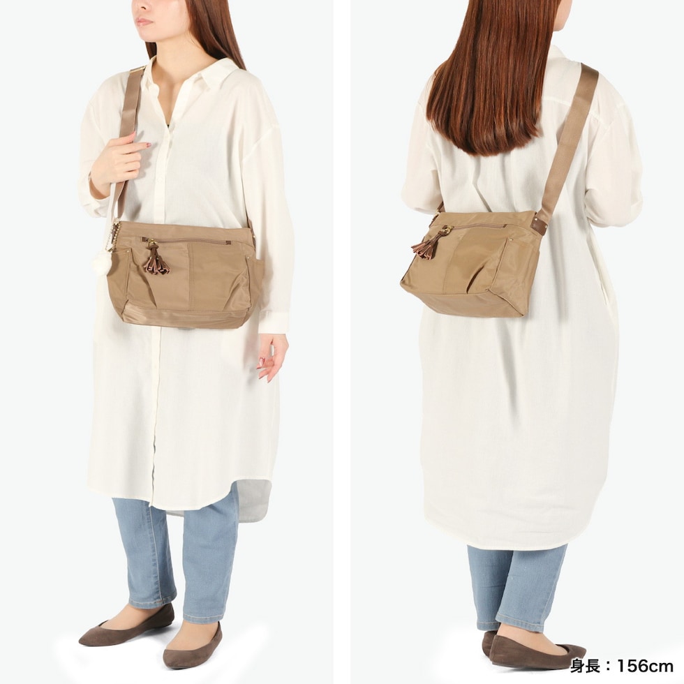 | タッセルがアクセント♪ 中まで大人可愛いバッグ 小さなタッセルをあしらったカジュアルバッグシリーズ『タッセル』から登場した横型ショルダーバッグ。ツヤ感ナイロン×フェイクレザーで上品に仕上げ、タック入りのふんわりシルエットが魅力。内装はピンクをベースにした木漏れ日柄で明るい印象。コンパクトなサイズながら、6L容量でポケットも充実。毎日使いから旅行まで幅広く活躍するアイテムです。 |