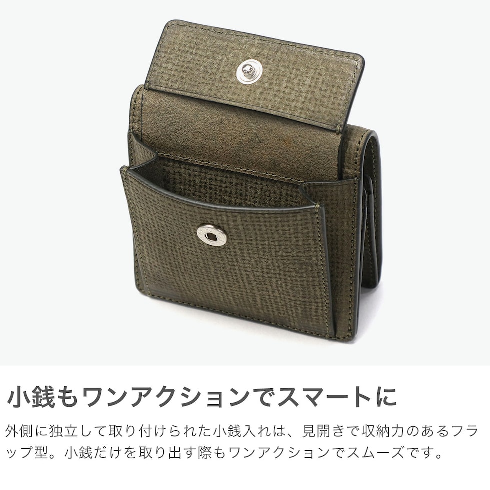 紙幣・カード・小銭をひとつにまとめたオールインワン仕様のミニ財布。紙幣がきれいに収まるコンパクトサイズで、ポケットやミニバッグにもすっきり収納可能です。内外装にはバダラッシカルロ社製プエブロレザーを使用し、麻袋によるグリッド状のエンボス加工を施した希少な「プエブロ テキスト」を採用。凹凸の濃淡が生む独特の経年変化を楽しめます。ミニマルなデザインと国内仕立ての上質感で、ギフトやペア使いにも最適な一品です。