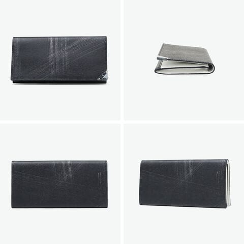 型押し牛革にシルバーの刷毛ムラプリントを施した、エレガントな長財布。シルバープリントと角に施したクリアブローチは、光を通したり反射したりと、ダウンライトや太陽の下で映えるデザインに。ブローチの仕様は面を取っているため手触りがよく、樹脂の中にゴム成分を配合することによって割れにくい仕上がりになっているので、安心してお使いいただけます。