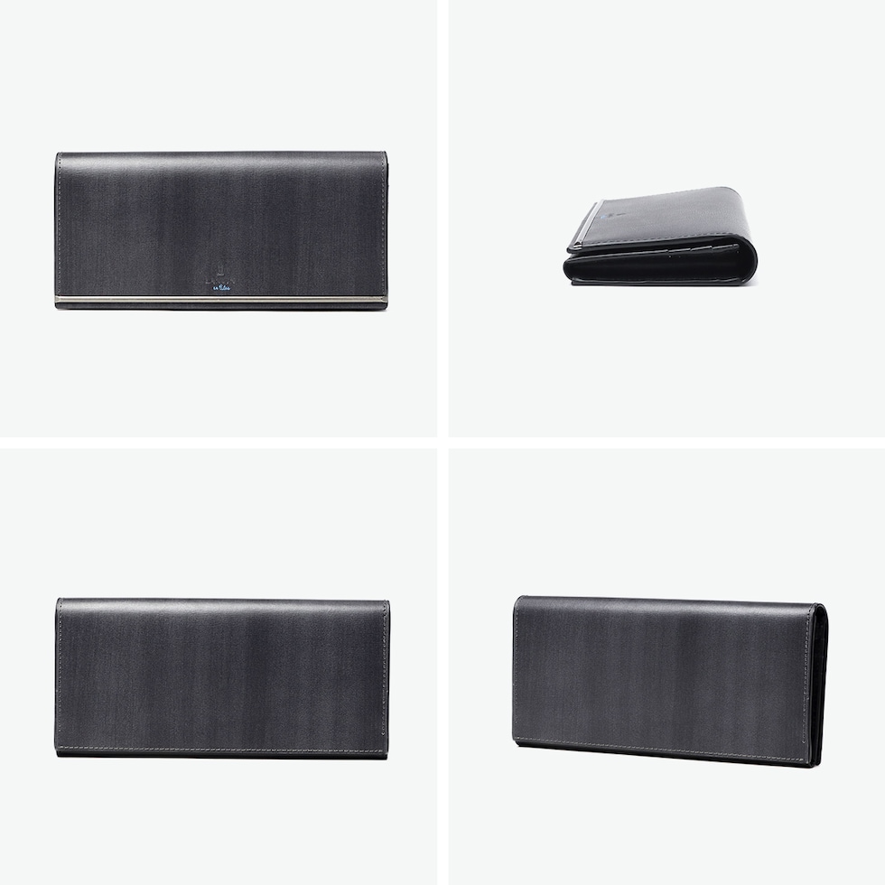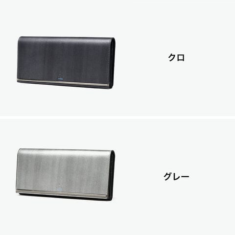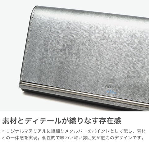 レザーロングウォレット スリガラス・かすれ・まだら・杢等のキーワードから作り上げたオリジナルマテリアルを使用した『レノア』シリーズの長財布。スタイリッシュで個性的な素材に、メタルバーをアクセントにあしらいました。充分な収納力を誇りながらもすっきりとしたシルエットを保ち、クールでスマートな印象に仕上げています。 |