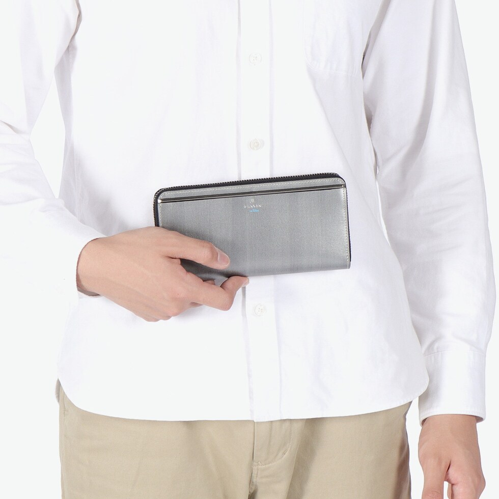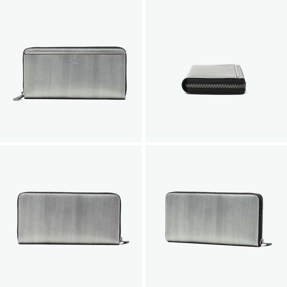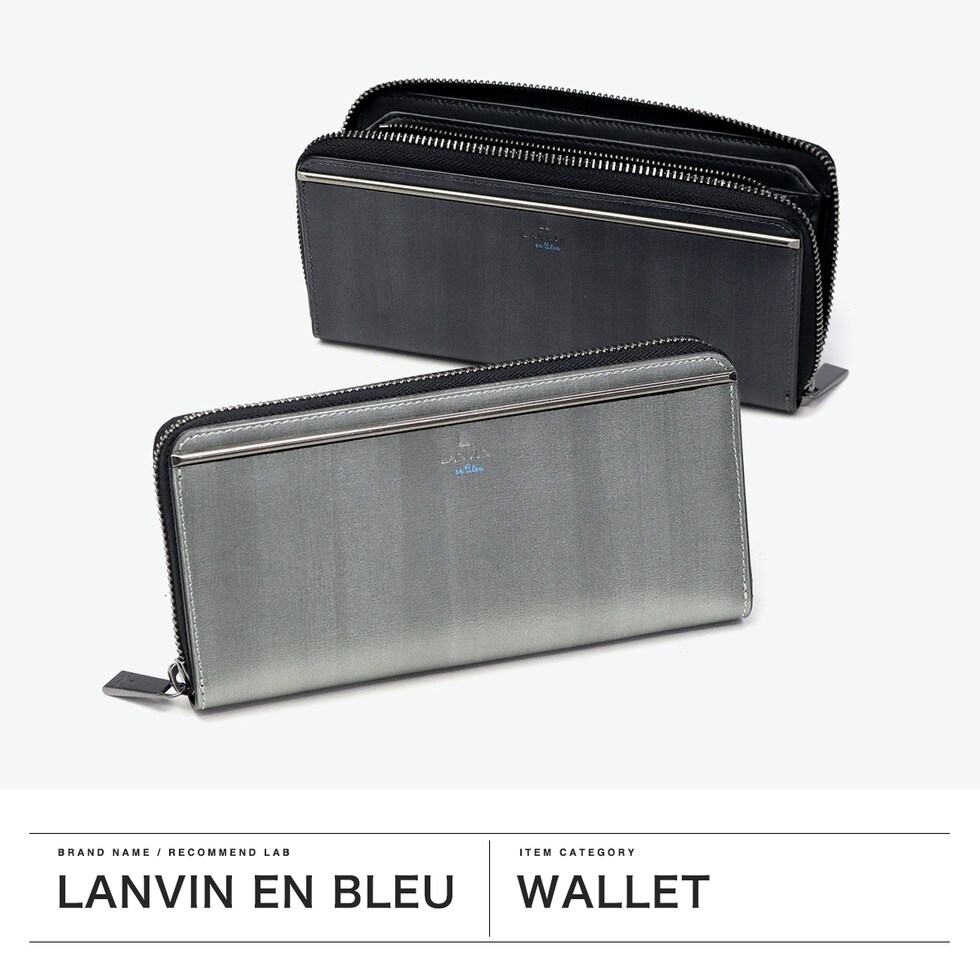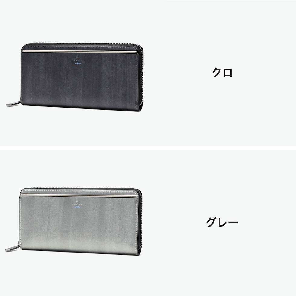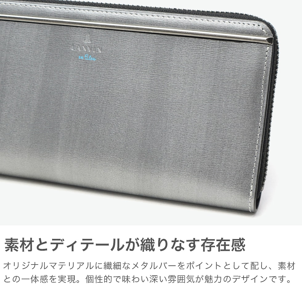 スタイリッシュな長財布 スリガラス・かすれ・まだら・杢等のキーワードから作り上げたオリジナルマテリアルを使用した『レノア』シリーズのラウンドファスナー長財布。スタイリッシュで個性的な素材に、メタルバーをアクセントにあしらいました。本体素材との一体感が魅力で、ガンメタルカラーに仕上げたLANVIN en Bleuらしいクールな表現が目をひきます。 |