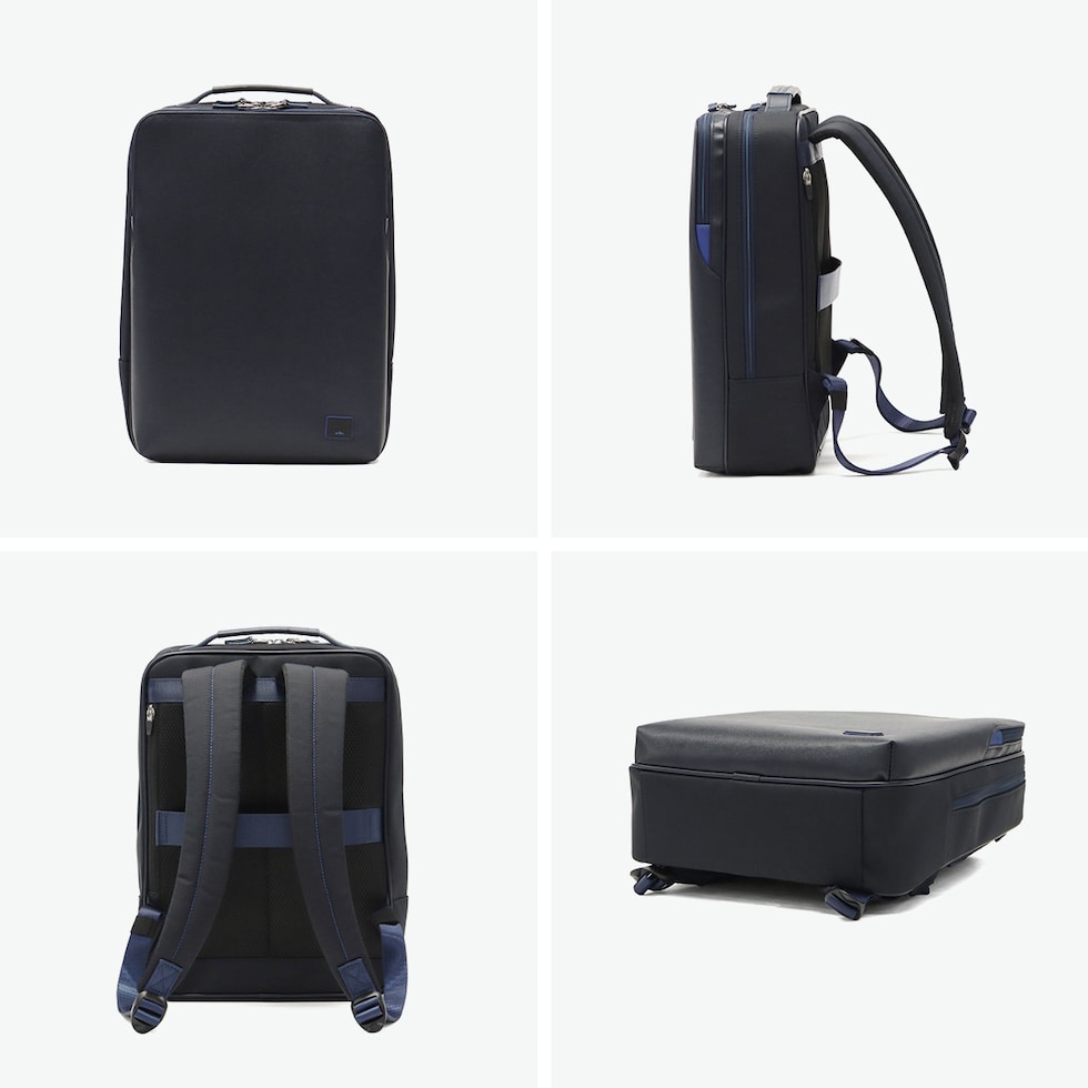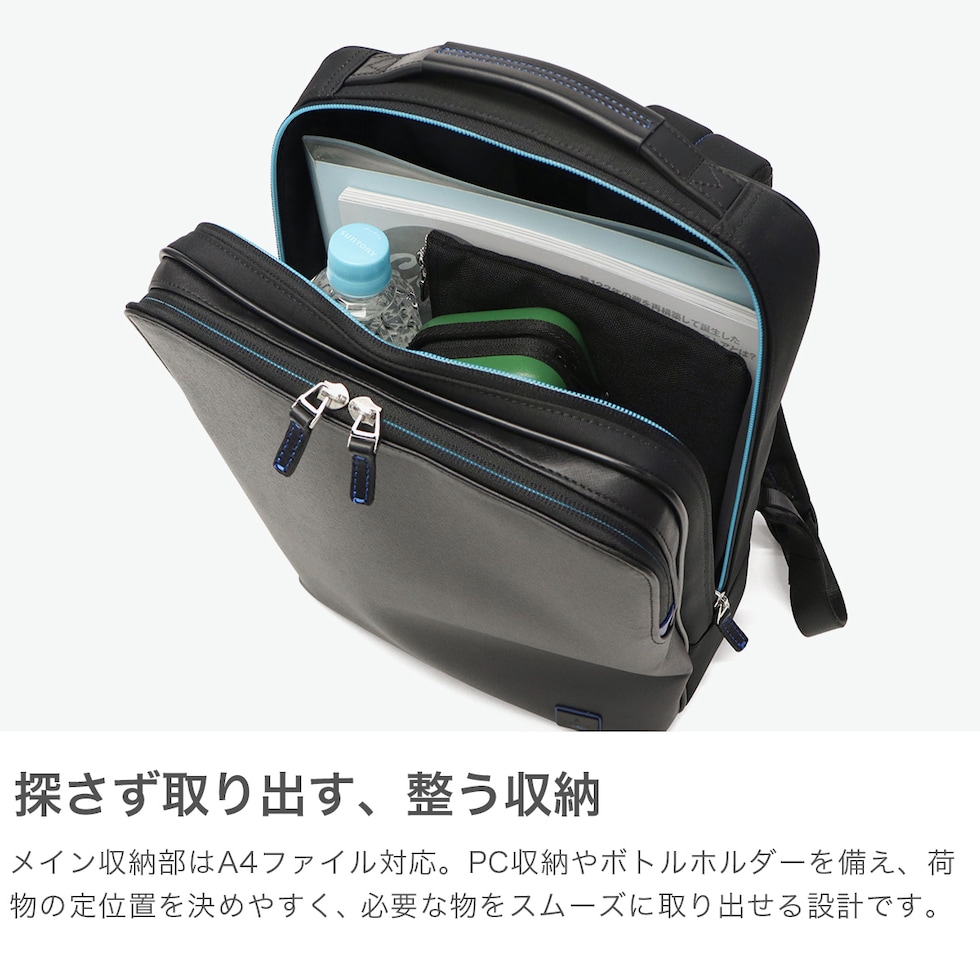 通勤をスタイリッシュに 水に強いサフィアーノPVC素材を使用した『ホームズ』シリーズのA4ビジネスリュック。ファスナーやステッチ、ロゴプレートのブルーのアクセントが効いた、ブランドらしい仕上がりです。スマートなデザインながらPC収納や多彩なポケットを備え、通勤から出張まで活躍します。 |