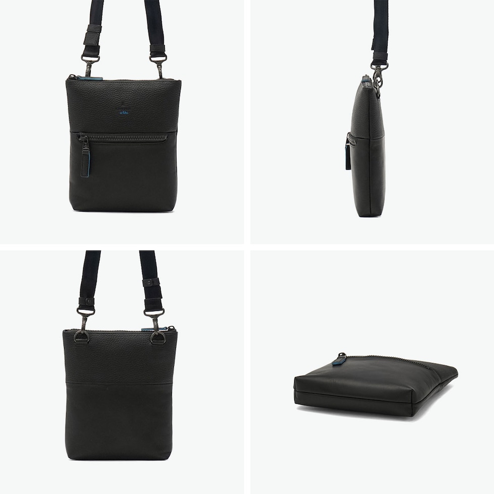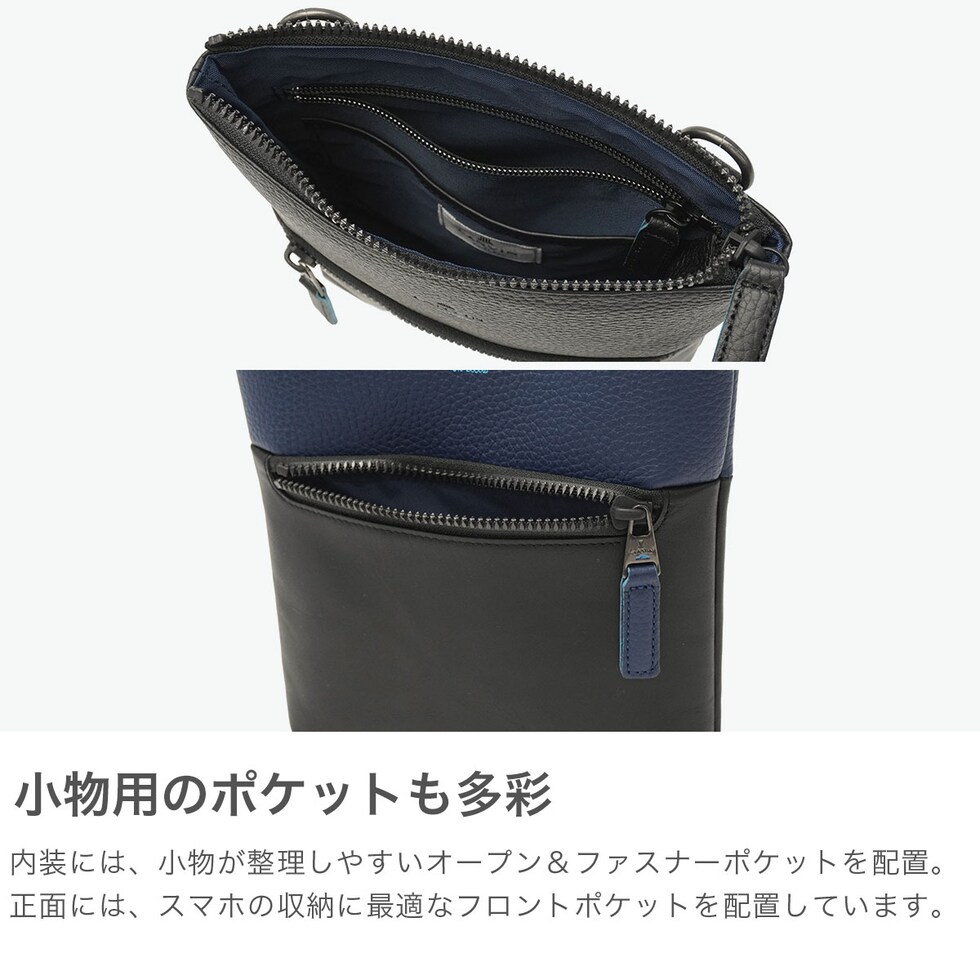 シックな雰囲気を演出 異なる素材をミックスし、大胆なバイカラーで仕上げたシリーズ『フェリチタ』。こちらは、コンパクトなレザーショルダーバッグです。エンボスレザーとソフトスムースレザーのコンビネーションが、シックな表情を演出。ショルダーの構造にも工夫を凝らし、体にフィットするように設計されています。 |